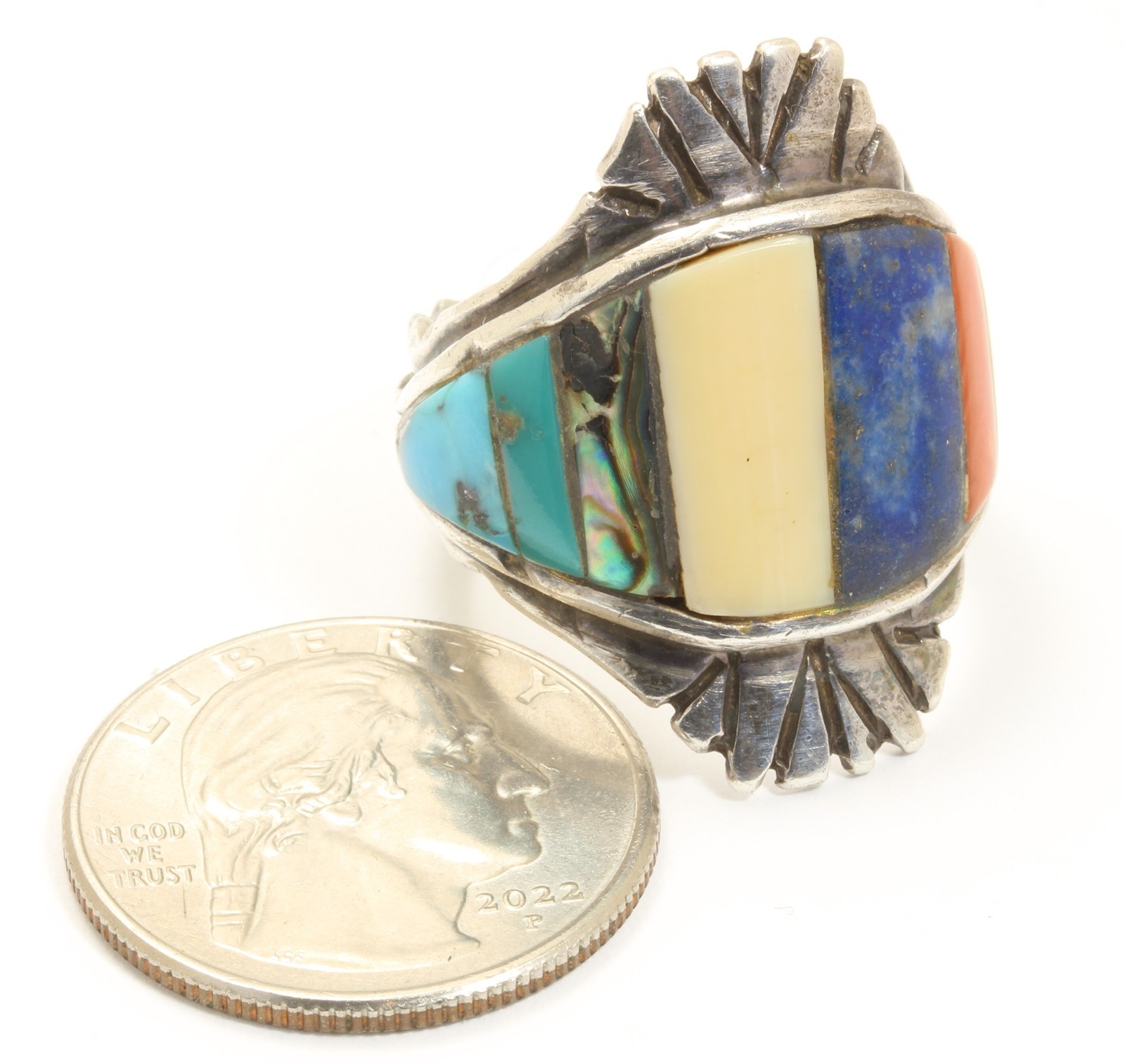 img Hello! You are bidding on Navajo Benny Armijo Sterling Silver Large Channel Inlay Row Band Ring Sz9.5! This beautiful ring was crafted by Navajo silversmith Benny Armijo in Sterling Silver and features a stunning row of channeled Turquoise, Abalone Shell, Lapis, Red Coral, & Serpentine Inlays that would look amazing on your finger, in your collection, or would be a perfect gift! The ring