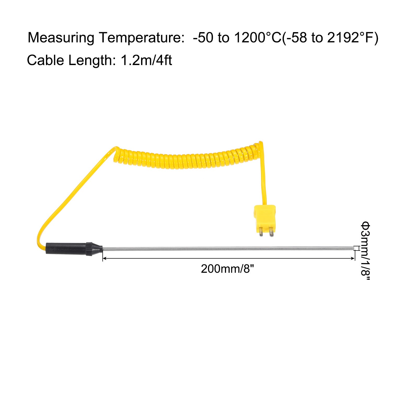 size of : 3mm x 200mm/1/8 inch x 8 inch(D*L) probe length; 1.2m/4ft cable length, -50 to 1200°C(-58 to 2192°F) measuring temperatureIn the package of: 1pcs x K type thermocoupleIs there any advantages of the product?K type surface thermocouples can measure a wide range of temperatures and can be used in both low and high temperature environments; K type thermocouple sensors, with high precision, accurate measurement, fast response time, can quickly measure temperature, convenient for daily life and industrial environment use; Thermocouples can be used for different types of temperature measuring equipment and instruments, such as temperature controllers, digital thermocouple thermometer, hvac digital gauges, lab digital thermometers, etc.How to use it?Steps of installation: 1. Select a thermocouple with appropriate
