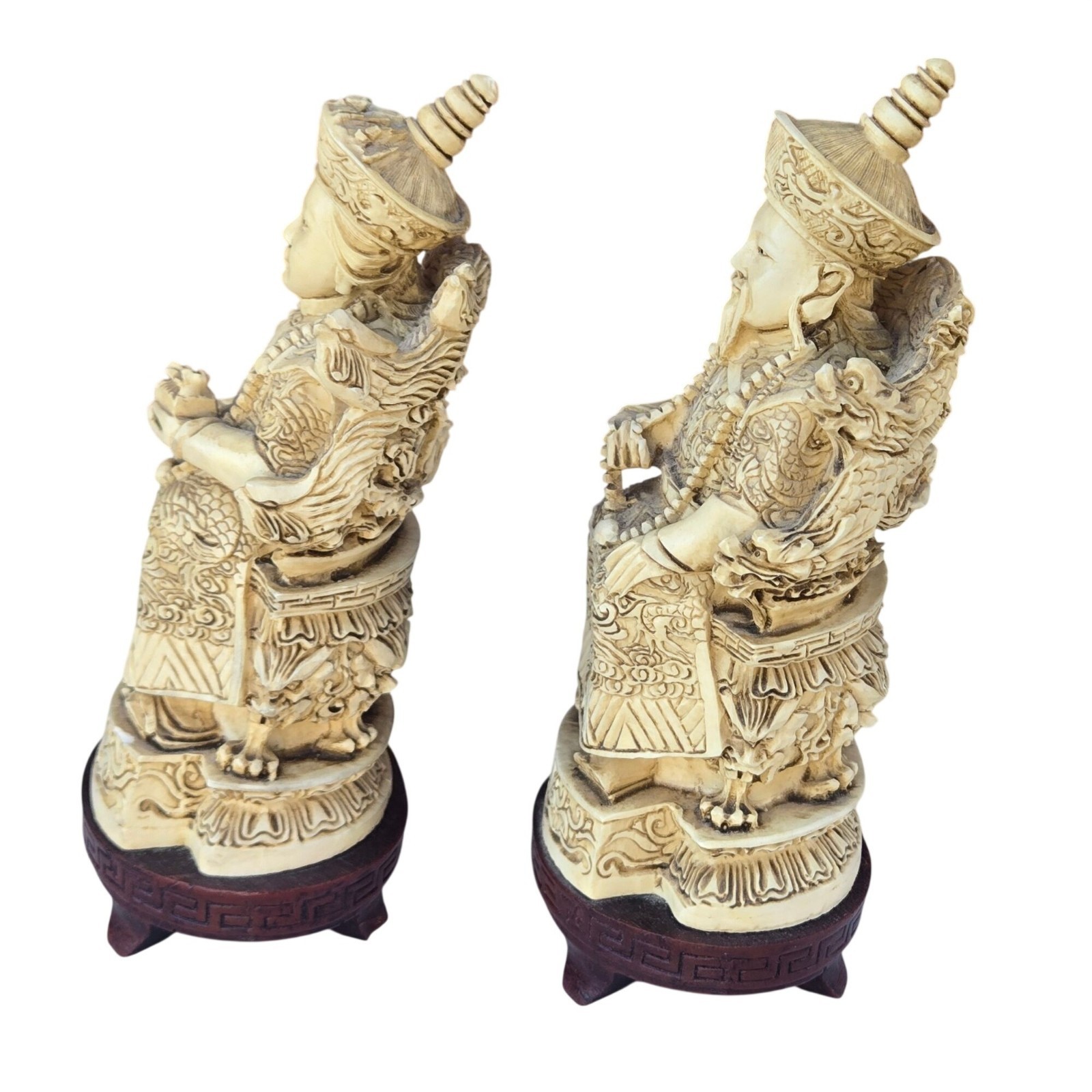 This Chinese Emperor and Empress resin figurine statue set is offered as-is in pre-owned vintage condition. Each figure measures about 7.5 inches tall. Noted condition issues include vintage dust in crevices, an empress chip (see photos), and a chipped base leg on the backside that does not affect balance. Both figures show scuffing and wear on the face. Please review all photos closely and check the listing for details on any additional flaws or included items. Free shipping is included with purchase.