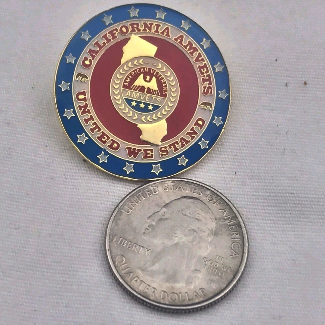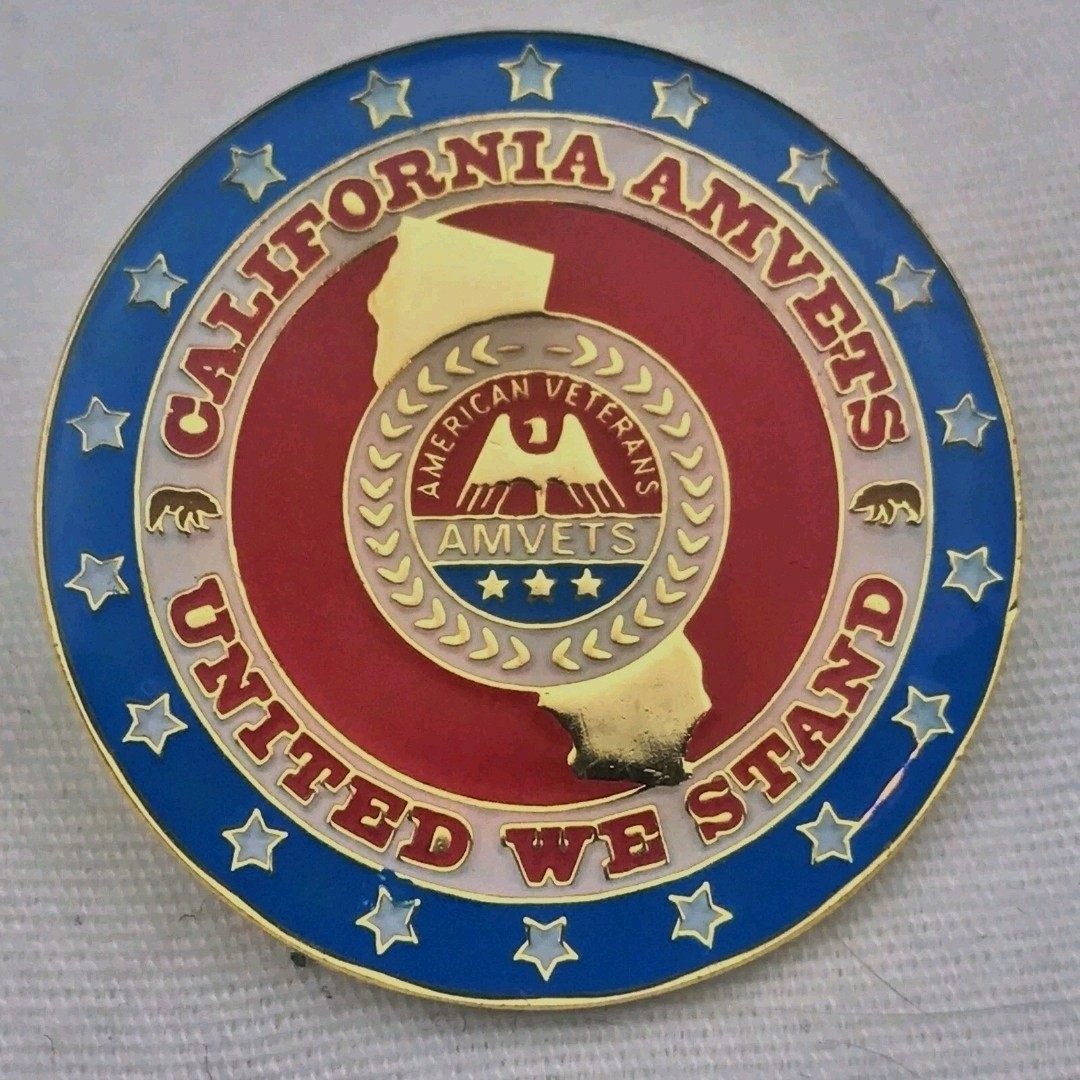 AMVETS Lapel Pin Blue Red Gold White Vintage Round California Outline Military VeteranCondition: Vintage Original item, see photos.Material: Metal, EnamelFeatures: Outline of California state, AMVETS logo with eagle, "United We Stand" text, Two bear silhouettesTags: Veterans, Military, California, Emblem, Insignia, Patriotic, Souvenir, Memorabilia, Brotherhood, Service, Loyalty, Collectible Pin