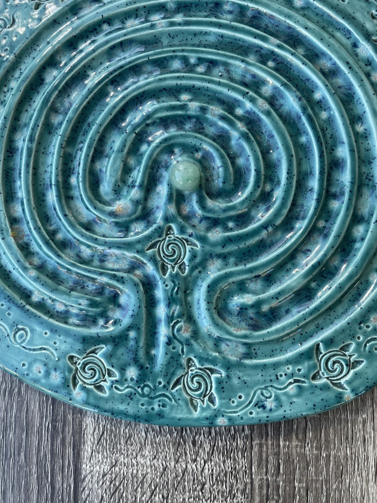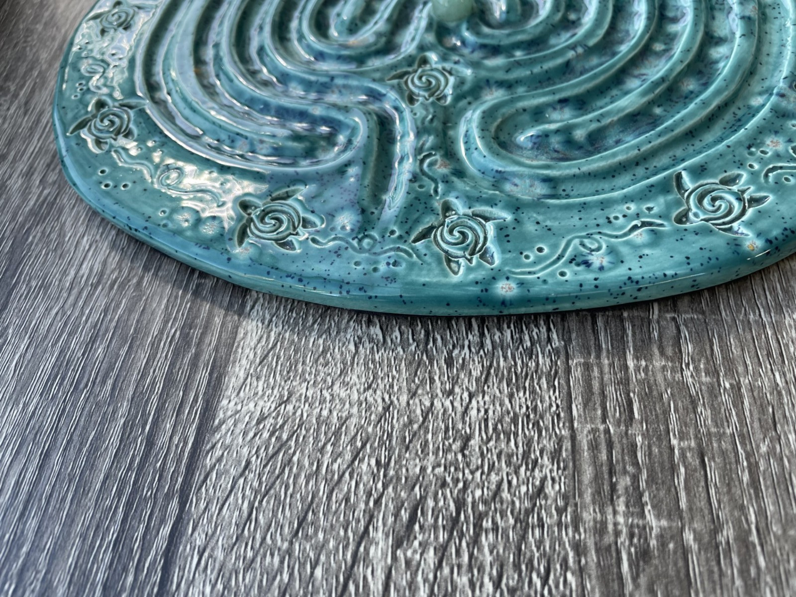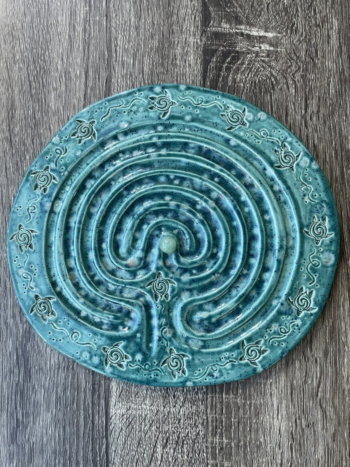 Handmade glazed ceramic finger labyrinth plaque featuring a detailed turtle border design and rich blue-green variegated glaze. This piece measures approximately 9.75" by 9" by 1/4". The surface features a raised classical labyrinth pattern designed for meditative tracing. The glaze has beautiful tonal variation and speckling that reflects its handmade origin. Felt backing is attached to protect surfaces. Condition is excellent. No chips, cracks, or repairs. Any variations in glaze