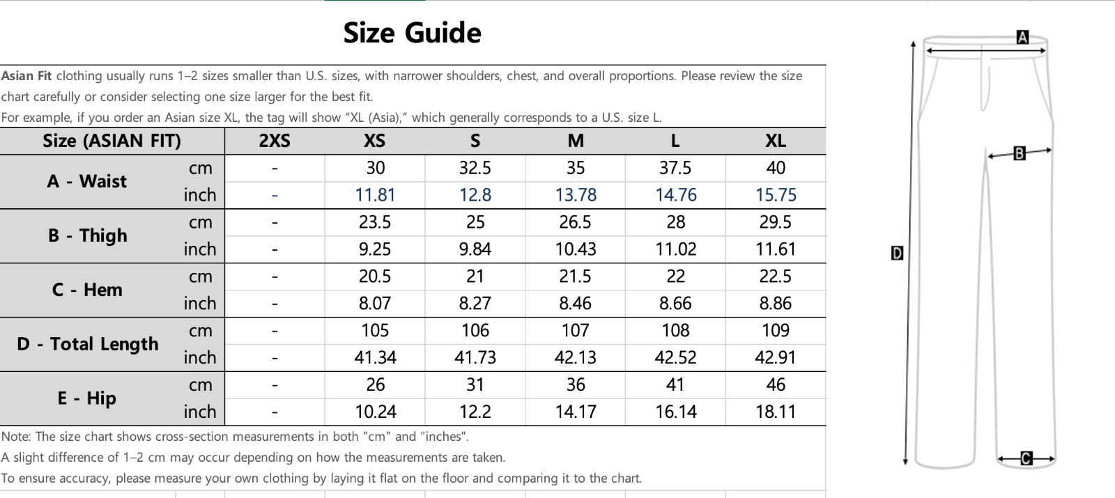 | Size | ASIA XS / US XXS |