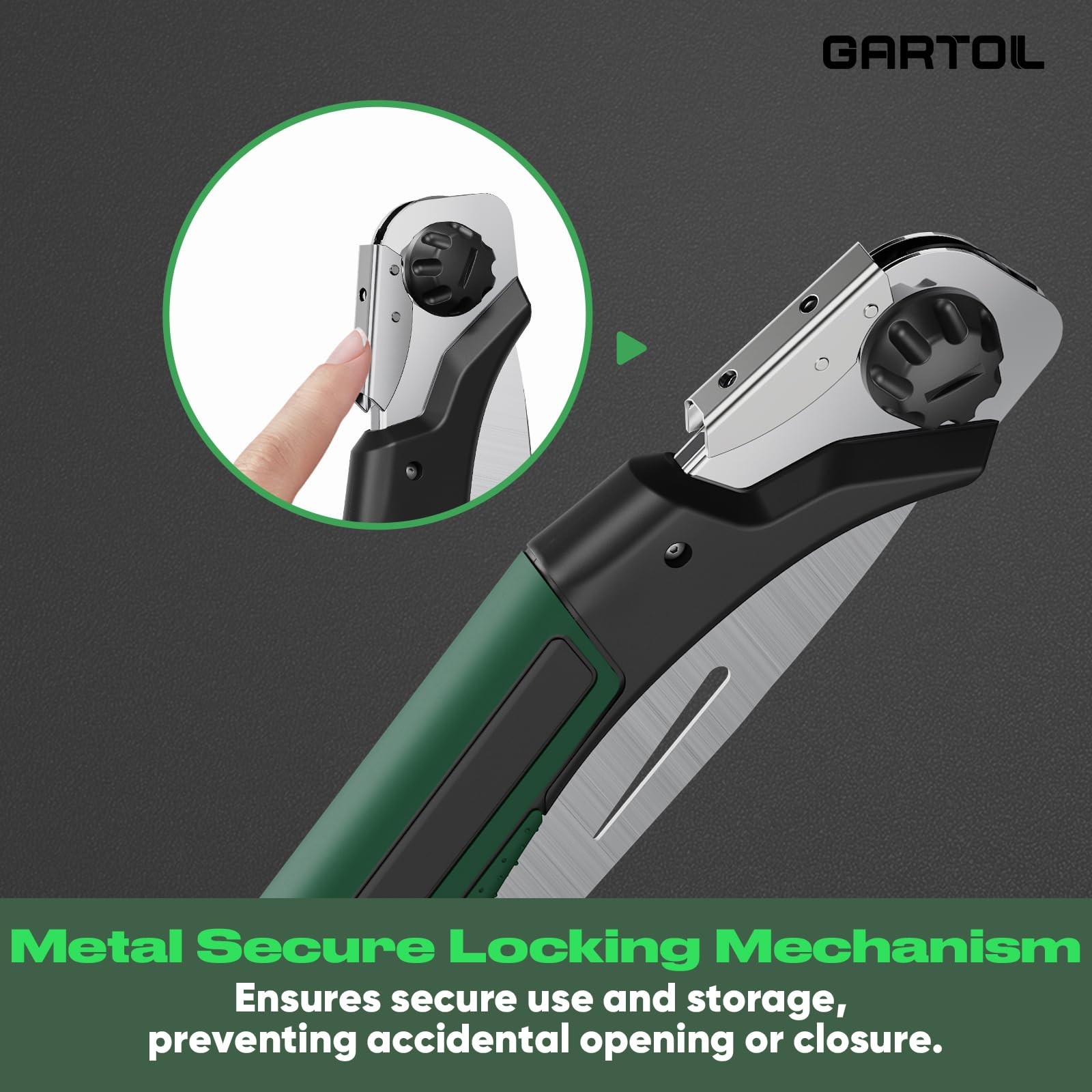 Product Details [Sharp 7 TPI Blade for Precision Cutting] Made from premium SK5 steel, this 8-inch folding saw offers sharp, durable triple-cut teeth blades that provide smooth and efficient cutting. Ideal for cutting branches, wood, bamboo, and plastic. Multi-purpose tool for gardening, camping, and DIY projects. GARTOL 8-inch folding saw with a 7 TPI (Teeth Per Inch) blade can generally cut through tree branches up to 4 to 6 inches in diameter [Portable and Foldable Design for Easy Storage] Lightweight and compact design, the 8-inch blade strikes the perfect balance between cutting capacity and portability, making it easy to carry in your backpack, tool kit, or camping gear. Its folding design saves space, making it a convenient tool for any adventure [Secure Locking Mechanism]The GARTOL camping saw is easy to open & close with the safe lock. The safety lock ensures secure use and storage, preventing accidental opening or closure [Ambidextrous Use Comfortable Handle] The ergonomic, non-slip handle ensures a comfortable grip, even during long hours of use, reducing hand fatigue. It is designed for both left- and right-handed users, making it a versatile tool for everyone. The