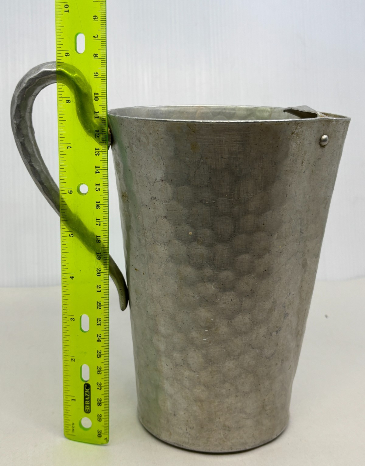Everlast Forged Aluminum Pitcher Vase/Decor/Display Stamped on bottom: EVERLAST, Forged Aluminum7.75 inches height of pitcher 8 7/8 inches height of pitcher at top of handle5 inches top diameterThis pitcher has an ice guard.According to Google AI, Everlast Metal Product Corporation was founded in 1932 by Louis Schnitzer and Nathan Gelfman. It's made from hand-forged, hammered aluminum. These pitchers were popular during the 1930s and 1940s, with Everlast introducing its "Forged Giftware" line in 1933. Clean with a gentle, non-abrasive detergent like Dawn, as aluminum is a soft metal. This pitcher has scratches and stains but is sturdy and useable as a pitcher and/or home decor. Examine photos closely.