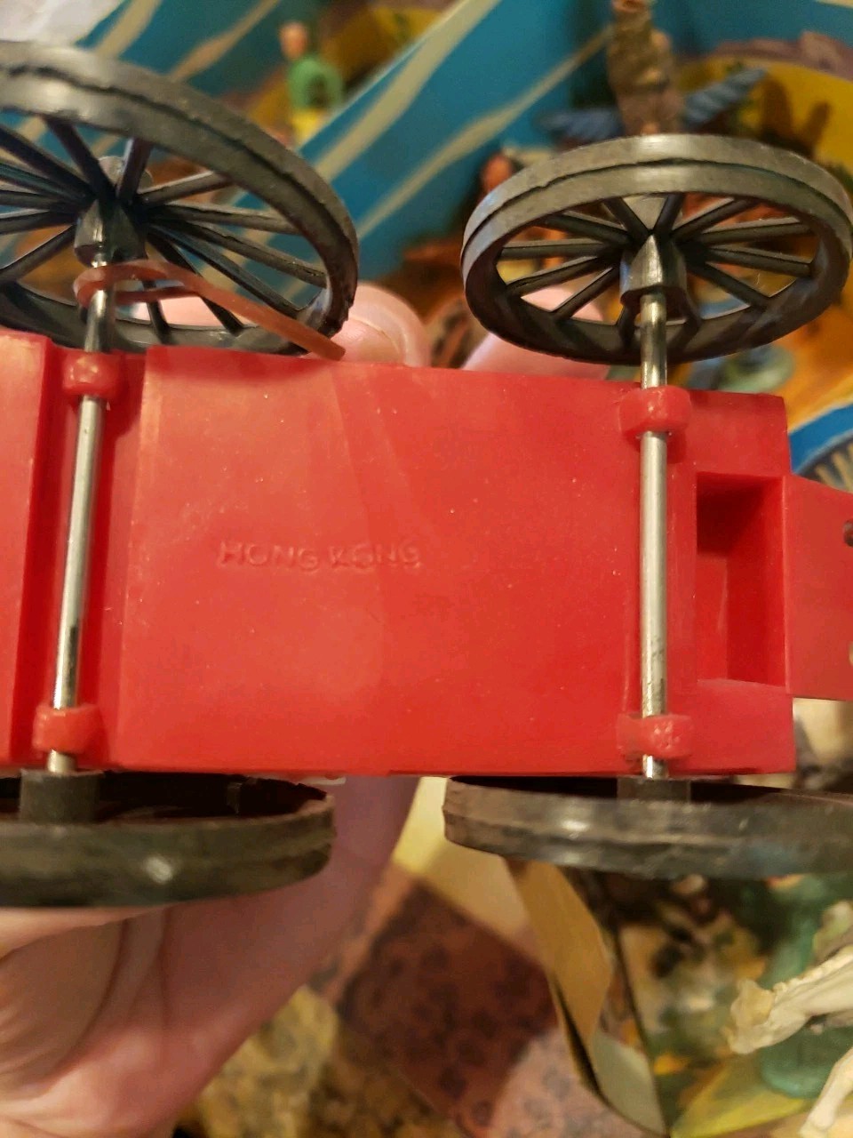 Ser of 3 Cintage Cowboy and Indian players In original diorama packaging. No box. Toys are dusty and need a cleaning. Barrel is loose in canoe. Marked Hong Kong.