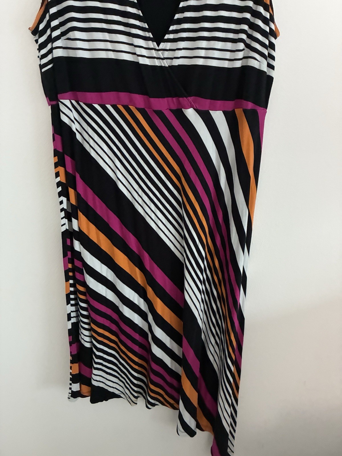 size 1X (18/20). The dress features a long length with an angled hem, perfect for a colorful and stylish look. The sleeveless design adds a touch of elegance, making it suitable for various occasions. Ideal for women looking for a fashionable and flattering dress option.