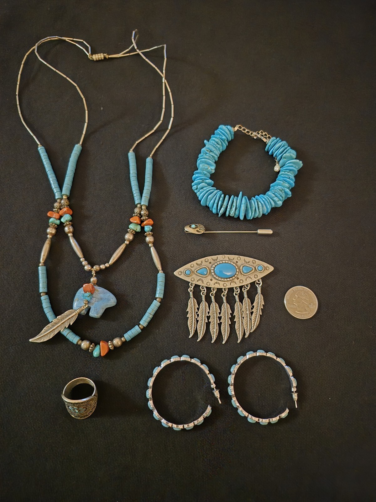 JJ Native American Turquoise Jewelry Set Necklace Bracelet Brooch Ring Earrings Specs