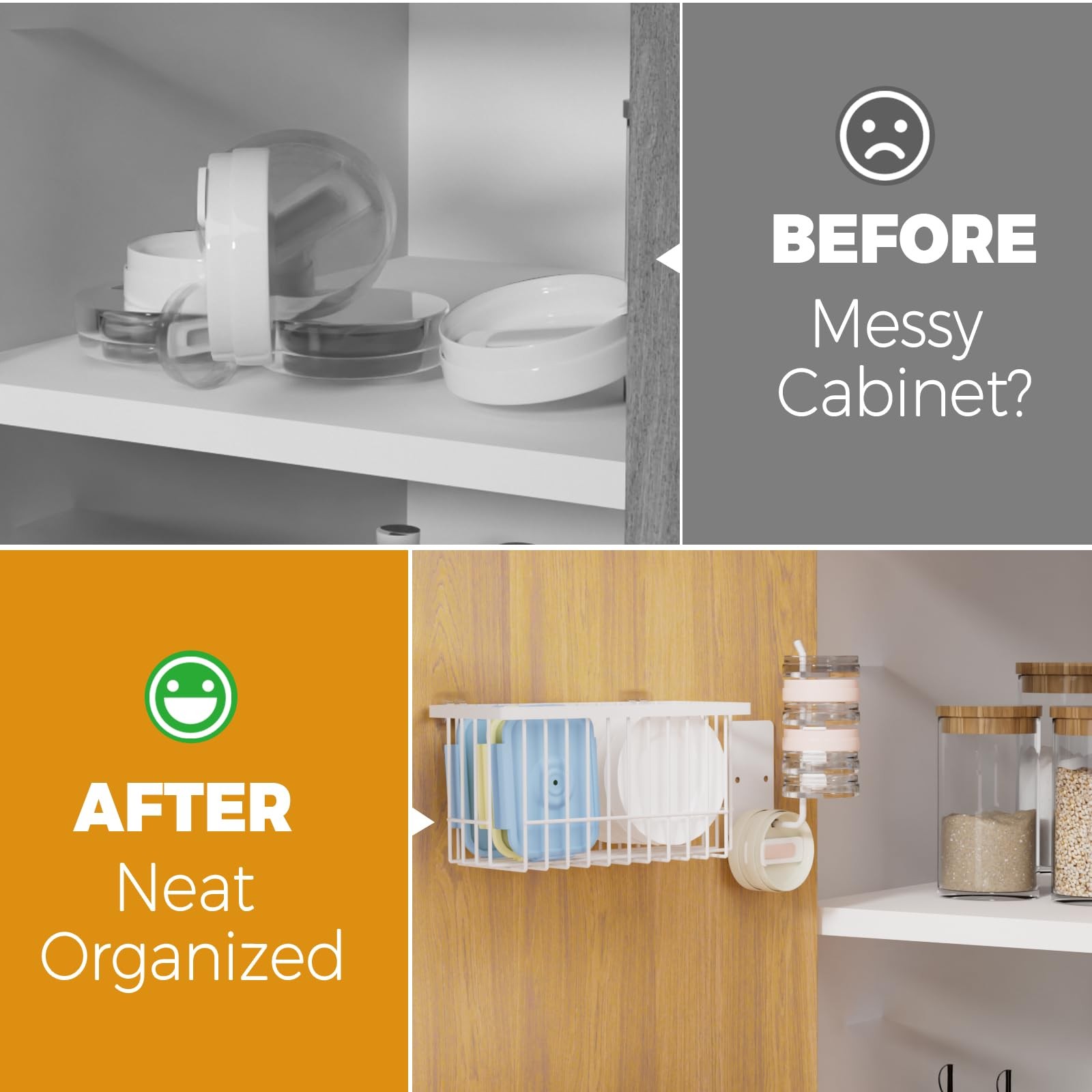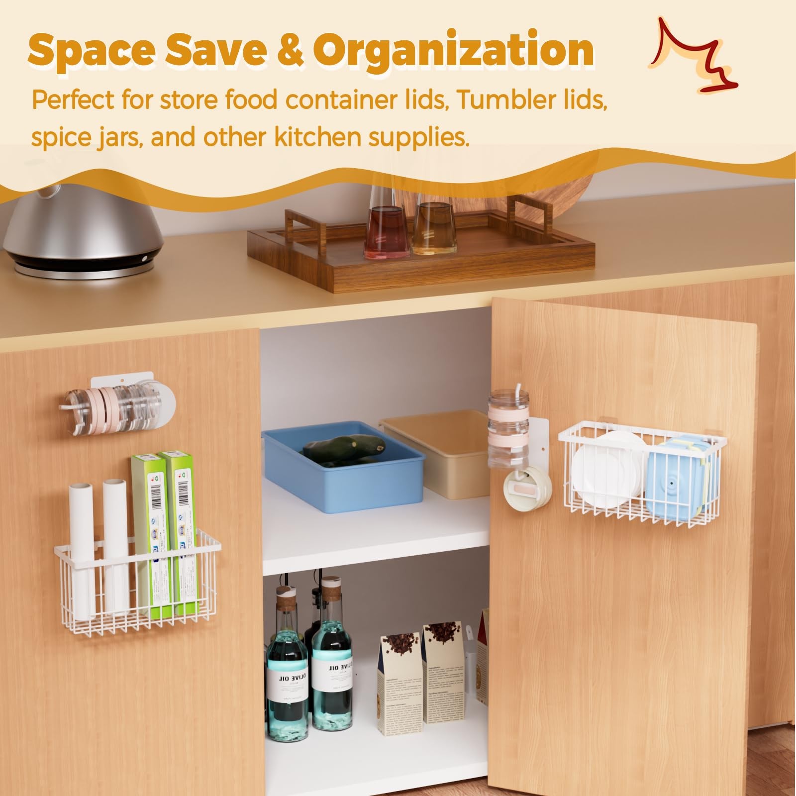 Product Details Maximize Your Storage Space - Easily mounts inside cabinet doors or kitchen walls to create extra storage, the 4 pack cabinet door storage perfect for organizing food container lids(Compatible for Tupperware, Pyrex), Tumbler lids(such as Yeti, Stanley, Simple Modern), spice jars, snacks, and small essentials without taking up shelf or drawer space. Strong Adhesive Backing - Simply peel and stick for instant organization. Holds firmly yet removes cleanly without damaging surfaces when needed. The tumbler lid storage also provides a drilling mounting. (Warm Tips: please note the spacing between the partition and cabinet door, allow over 3.74 inches of space for the basket. ) Perfect for Kitchen & Beyond - This cabinet door organizer set is ideal for organizing spices, coffee pods, cleaning supplies, shampoos, shower gels, face cleansers, and toilet as a roll holder or office stationery in kitchens, bathrooms, and offices. Heavy Duty & Durable - The kitchen cabinet organization is made from high-quality iron material to create a stable, not easily deformed, ensuring that long-term use will not damage. Perfect Size for Storage - 4 Pack Cabinet Organizer Set! Large basket: 8.66"*3.74"*4.72", Small basket: 8.27"*3.35"*4.57", 2* Tumbler lid holders length: 5.9". Fit various small items, keeping everything tidy and within easy reach.