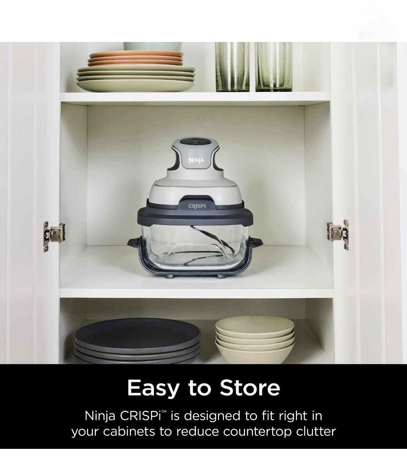Introducing the Ninja Crispi Portable Cooking System. This compact powerhouse packs the 1500W power of a full-sized air fryer into a portable design*. It includes a large batch 4-QT CleanCrisp container that fits up to 4 lbs of wings or 2 lbs of fries, a storage lid, and crisper plate. The PowerPod intelligently senses and adjusts to the container size, ensuring a perfect cook no matter what. The durable borosilicate glassware withstands extreme temperature changes from 22F-450F, and it’s safe to cook directly on granite countertops, laminate, quartz, butcher block, marble, and more. Cleanup is simple-the CleanCrisp glassware, storage lid, crisper plate, and adapter are dishwasher safe and designed to nest for easy storage. Cook, serve, and store effortlessly with Ninja Crispi.ALL-IN-ONE SYSTEM: Includes the Ninja Crispi PowerPod, 4-qt CleanCrisp glass containers, and storage lid • CRISPI POWERPOD: The power of a full-sized air fryer now in the palm of your hand • LARGE BATCH CONTAINER: The 4 QT CleanCrisp container fits a 4-LB chicken and veggies • FROZEN TO CRISPY WITH NO SHATTERING: High-grade borosilicate glassware can withstand extreme temperature changes from 22F-450F • 3-in-1 FUNCTIONALITY: Max Crisp, Air Fry, & Recrisp • FIXED HEAT PROTECTION: Permanently fixed heat-safe feet so you can safely set it on granite, laminate, quartz, butcher block, marble, and more • EASY STORAGE: Ninjas Crispi PowerPod and CleanCrisp glassware fit easily in your cabinet to keep your countertops free
