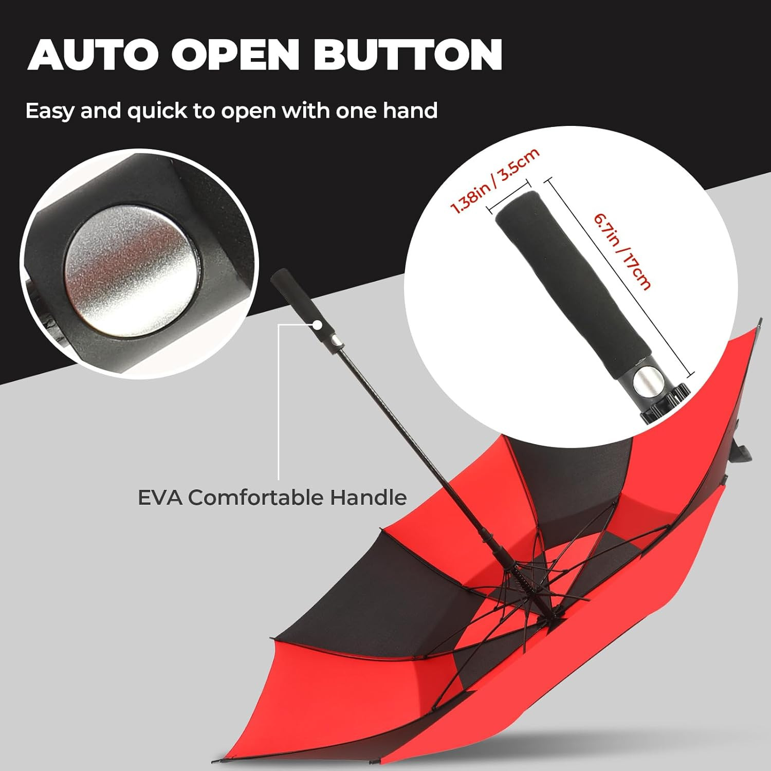 size 62 Inch, Black/Red Description Color Black/Red Size 54 Inch Product description Double Canopy Golf Umbrella Well Made Large Umbrella Automatic Open Umbrella With EVA Handle 1 Weather Resistant 2 Extra Large Golf Umbrella 3 Widely Used Umbrellas What is the diameter of the umbrella when open? The canopy diameters of the umbrella when open are different. 54"(diameter 45in), 62"(diameter 52in), 68"(diameter 59in), and 72"(diameter 66in). Can the umbrella be used in the sun? Yes, this umbrella can be used in the sun. It is designed to provide protection from both rain and sun, making it suitable for outdoor activities like golf, walking, and more. What is the weight of the umbrella? The item weight of the 54" umbrella is 1.35lbs, 62" umbrella is 1.55lbs, 68" umbrella is 1.6lbs, 72" umbrella is 2lbs. Is the umbrella easy to carry around? Yes, this umbrella is easy to carry around. It is lightweight, especially considering its large size, and comes with a cover for convenient transport.