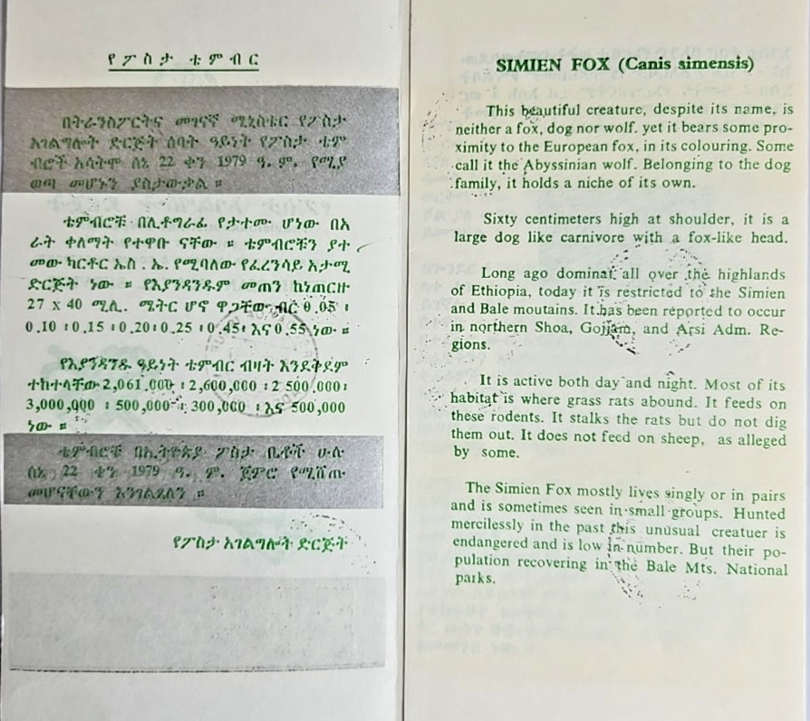 The Post Office Department of the Provisional Military Government of Socialist Ethiopia issued a Set of Seven Stamps for the SIMIEN FOX DEFINITIVES. This is the First Issue for the Simien Fox Series.There was NO Official First Day Cover [FDC] Issued. The Post Office does not usually Issue Official FDCs for Definitive Stamps and Collectors Prepare their Private FDCs, respectively.This First Day Cover was prepared by an Individual Collector and have it Cancelled on the First Day of Issue [29 June 1987]. The Simien Fox Postcard, the Stamps and the Official Pamphlet are all in very Fine Condition.It is a Very Nice Philatelic Item for Interested Collectors. Very RARE to Find.