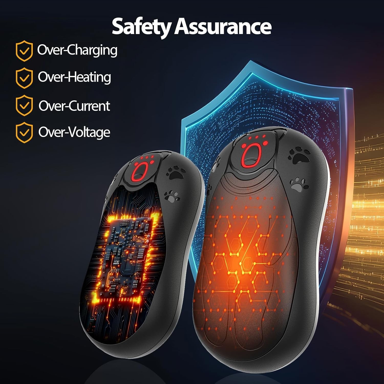 【2-Pack with 12000mAh Power】 This value set includes two powerful hand warmers, each equipped with a substantial 6000mAh battery, combining for a total of 12000mAh of reliable power. Each unit is a compact portable pocket warmer, offering exceptional value and ensuring that you and your loved ones have dependable, long-lasting heat anywhere you go.【Dual-Side Rapid Heating】 Experience fast, even warmth from both sides. These rechargeable hand warmers offer three precise temperature settings (42°C, 48°C, 52°C), providing customizable comfort that outperforms single-use options.【3-Temp & Long Runtime】 Designed for all-day use, these hand warmers rechargeable deliver outstanding endurance. Enjoy up to 12 hours of heat on low, 9 hours on medium, and 6 hours on high, making them perfect for long outdoor activities.【Advanced Safety Assurance】 Built with comprehensive safety features including OVP, over-charge/discharge, and NTC protection. This electric hand warmer is designed for worry-free operation, ensuring complete peace of mind.【Perfect Winter Gift】 These premium handwarmers are the perfect gift. Elegantly packaged as a set, they are a thoughtful and practical present for any occasion during the cold seasons.Product DescriptionPrevious page