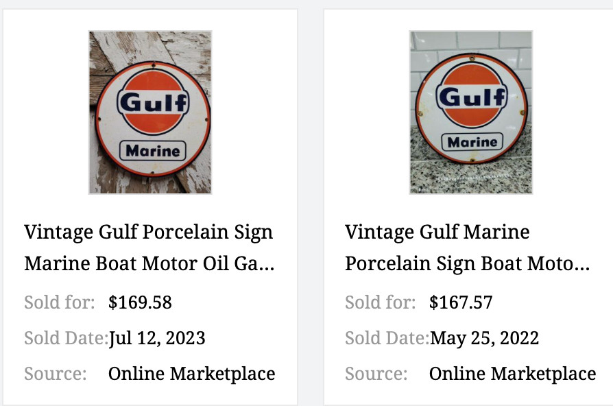 FOR YOUR CONSIDERATION IS A VINTAGE "GULF MARINE WITH AWESOME OLD TIME GULF SIGN & MARINE GRAPHICS 11 3/4" BY 11 3/4" ROUND PORCELAIN METAL (1 POUND, 6 OUNCES) GASOLINE & OIL ADVERTISING PUMP PLATE SIGN. THIS SIGN HAS FANTASTIC GRAPHICS OF THE VERY HARD TO FIND GULF MARINE. PICTURE 3 SHOWS THIS SAME SIGN SELLING IN MUCH WORSE SHAPE FOR OVER $169.00 & 167.00 ON TWO OCCASIONS. THIS SIGN IS A GREAT DEAL FOR $129.99 OR BEST OFFER!!! THIS SIGN IS IN NEW OLD STOCK CONDITION AND HAS ALWAYS BEEN DISPLAYED INDOORS. THIS SIGN MEASURE 11 3/4" BY 11 3/4" AND IS ROUND AND WEIGHTS: 1 POUND, 6 OUNCES AND IS MADE OF PORCELAIN METAL WITH A WHITE BACK THE CONDITION OF THE SIGN IS GORGEOUS. I AM 74 AND DOWNSIZING MY LARGE SIGN COLLECTION! BE SURE TO SEE MY OTHER LISTINGS FOR MORE SIGNS!!!!!!! THIS SIGN WAS PURCHASED WITH A COLLECTION OF SIGNS, SO CHECK MY OTHER LISTINGS FOR MORE NEAT PORCELAIN & METAL SIGNS AS WELL AS SOME NEAT MAN CAVE AND SHE SHED ITEMS AND ANTIQUES. ALL ITEMS ARE PROFESSIONALLY PACKED AND SHIPPED WITH CARE. I HAVE BEEN COLLECTING ANTIQUES AND WHAT I LIKE FOR THE LAST 50 YEARS AND I HAVE DECIDED TO DOWNSIZE AND SELL MY LARGE COLLECTION SO BE SURE TO BOOKMARK ME AS YOUR FAVORITE SELLER AND CHECK MY OTHER LISTINGS.. THANKS FOR LOOKING.SKU # ORANGE 80 (GULF MARINE