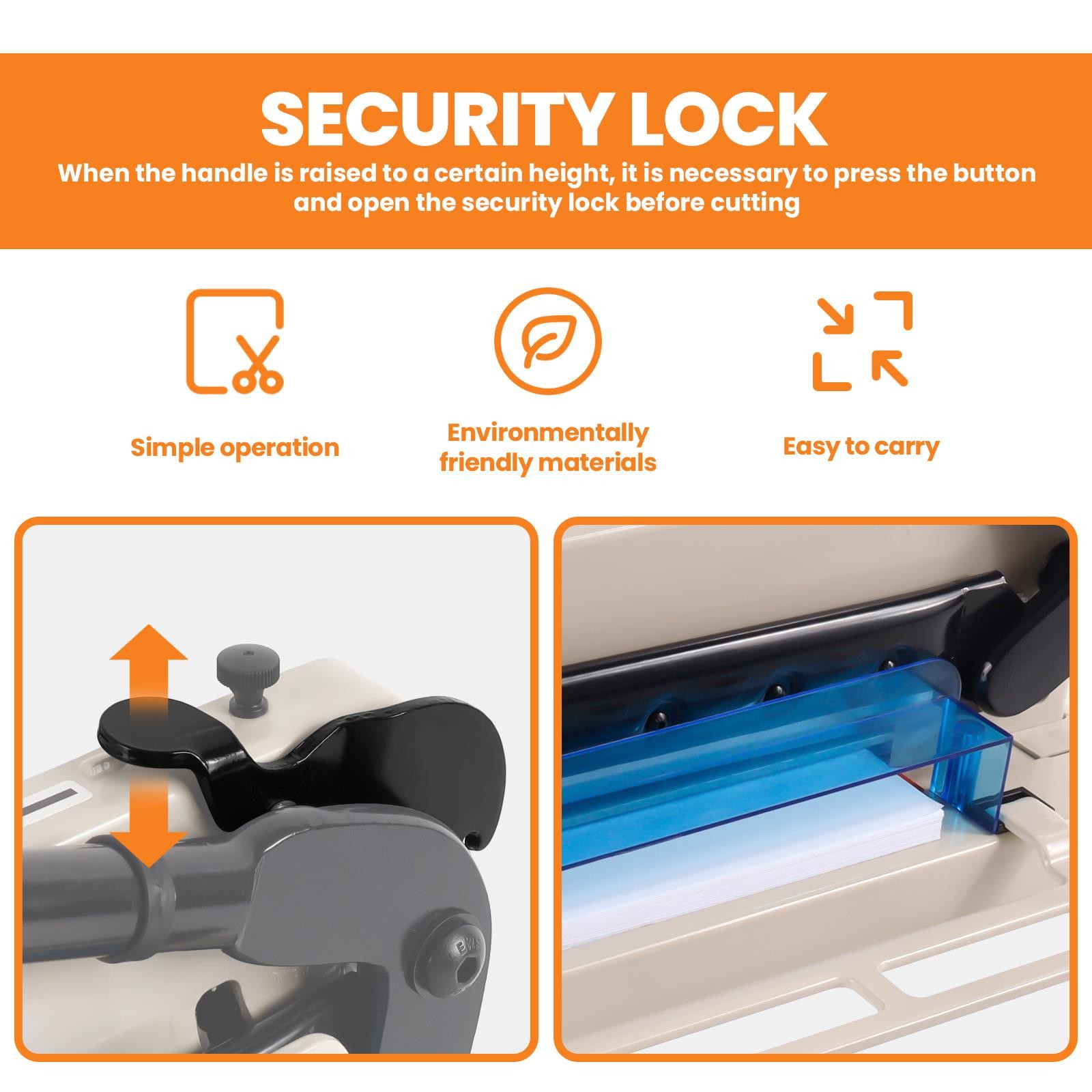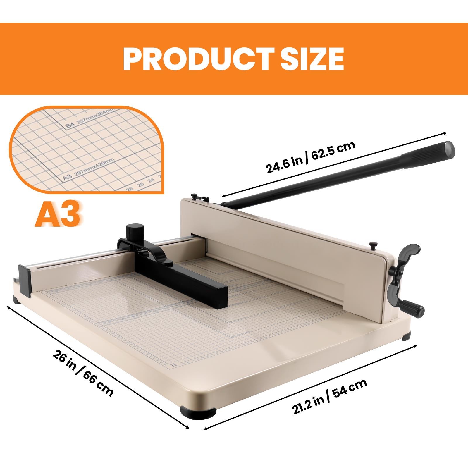 Material Solid Steel Construction Safety Features Safety Lock + Protective Cover, Automatic Locking Knife Paper Sizes Supported A3, A4, B5, A5, B6, B7 Additional Materials Cuts Leather, PVC, Non-Woven Fabrics Clamp Type Heavy-duty clamp for uniform pressure, prevents shifting Handle Grip Threaded anti-wear, anti-slip design California Prop 65 No warning applicable Shipping From California (CA) & New Jersey (NJ) ✂️ Key Features 📄 400 Sheets Capacity Cuts up to 1.6" thick stacks (400 sheets A3) with precision - heavy duty clamp prevents shifting 🔒 Double Safety Protection Safety lock + protective cover, automatic locking knife prevents finger contact ⚔️ Sharp HSS Blade Hardened steel blade, removable and replaceable for long-lasting sharpness 📏 Extended Lever Design 24.6" handle longer than body for labor-saving cutting, anti-slip threaded grip 🔧 Solid Steel Construction Durable steel frame ensures stability and long-lasting performance 📐 Versatile Cutting Supports A3, A4, B5, A5, B6, B7 paper sizes + leather, PVC, non-woven fabrics 📐 Dimensions & Specifications Overall Size 26" × 21.2" × 8" Cutting Width 17" Cutting Thickness 1.6" /4 cm Sheets Capacity 400 sheets Handle Length 24.6" Blade