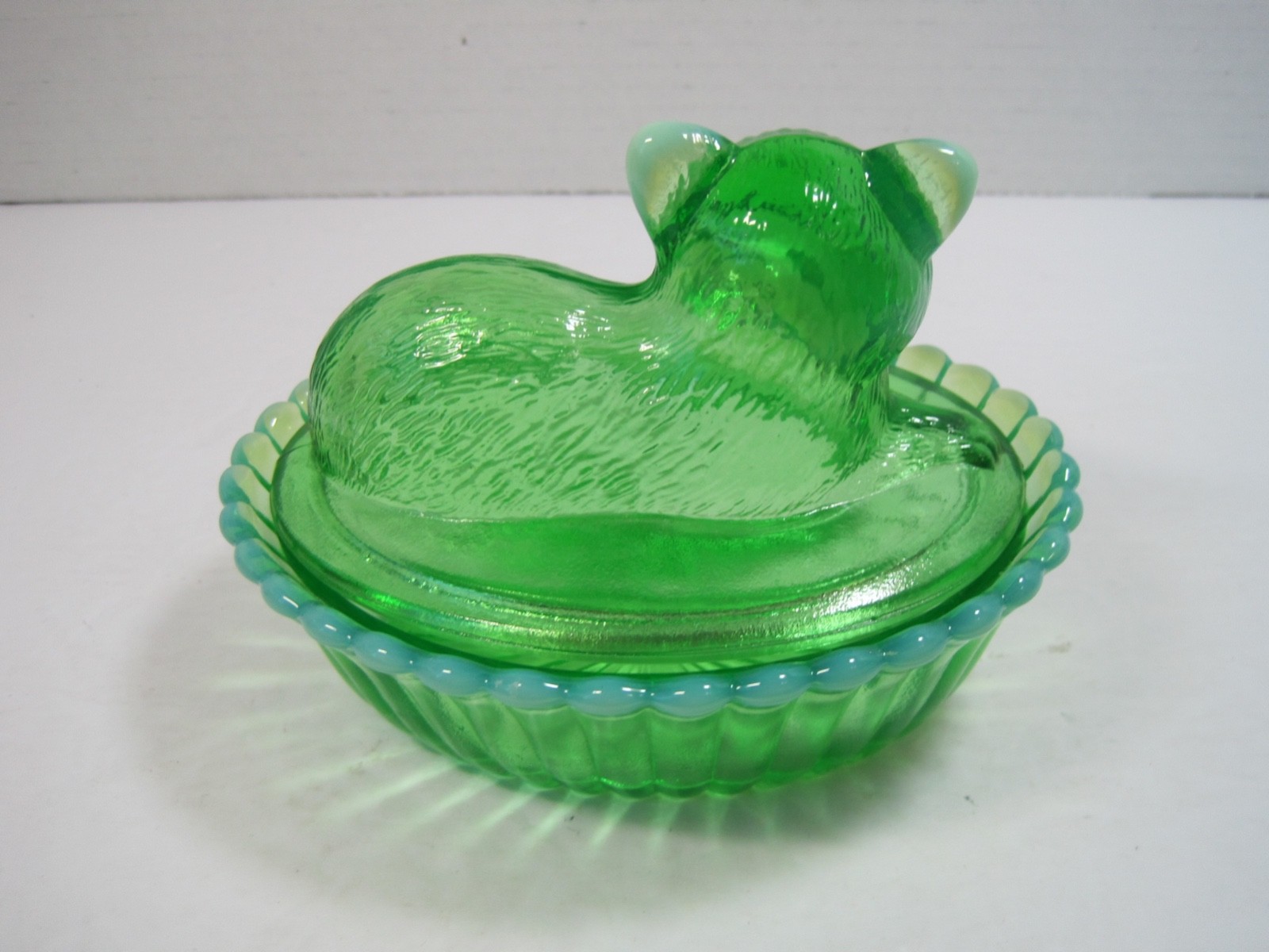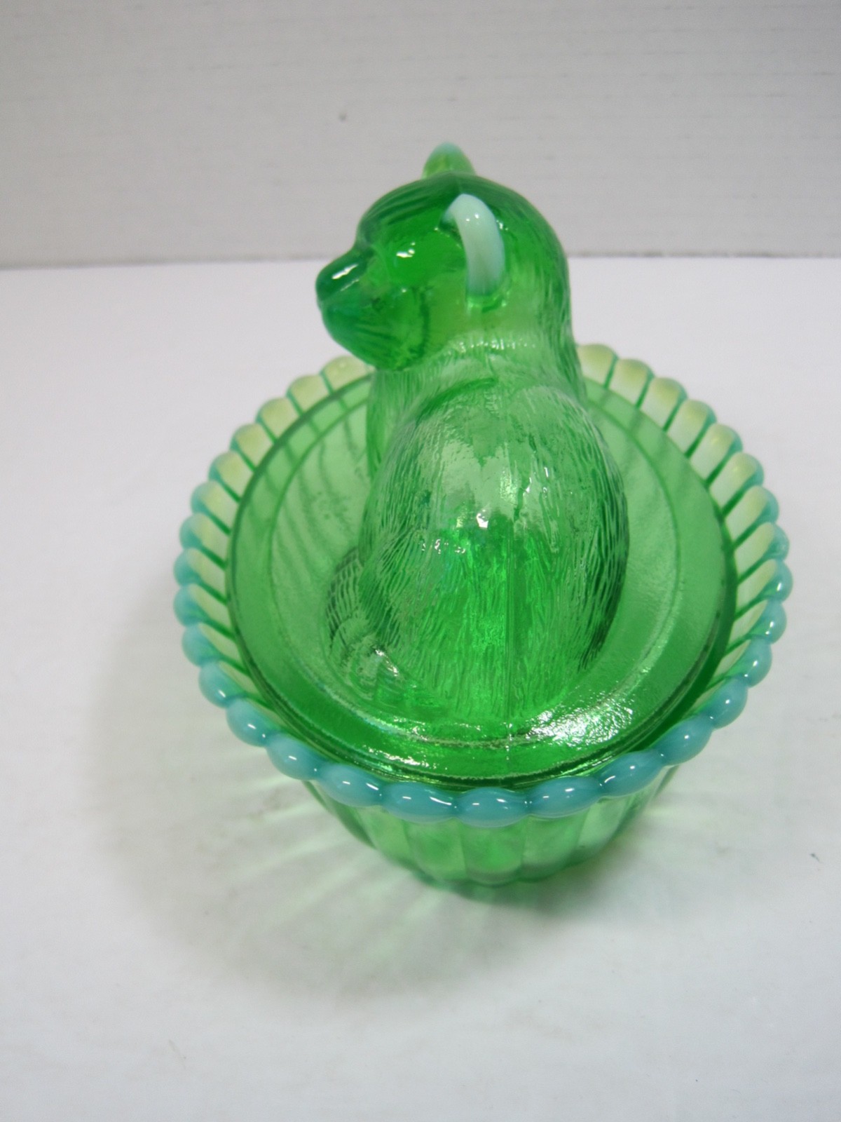 Westmoreland Green Opalescent Cat in Nest Candy Dish, Trinket