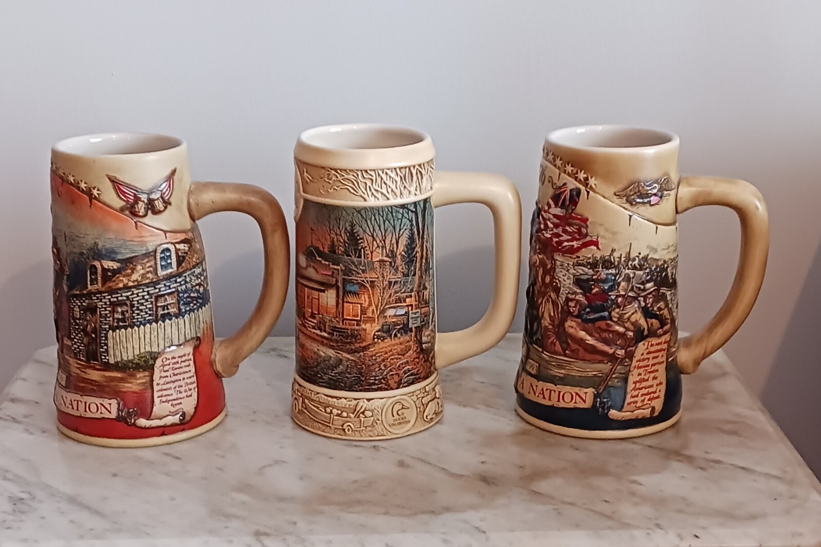 The product is a set of 3 vintage beer steins from the Miller Brewing Company. These collectible glasses are part of the Breweriana theme and are a great addition to any beer memorabilia collection. Set includes one (1) numbered 1991 First in the series of "Birth of a Nation" . One (1) numbered 1993 Third in the Series of "Birth of a Nation", and one (1) numbered 1997 Third in the series of "Welcome to Paradise" from the Ducks Unlimited Terry Redlin Collection. All steins are in perfect condition with no cracks, chips or imperfections.