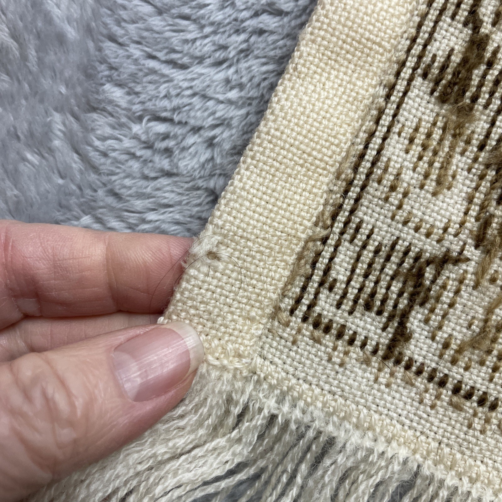 Obvious signs of wear/holes, but most occur on the underside and aren't evident from the top. Gorgeous piece, and I wouldn't be surprised if it's antique. It feels like it could be wool.Refer to pictures for approximate flat measurements as items may have been altered. Actual colors and fit may vary slightly. ~Spread goodness today~God Bless