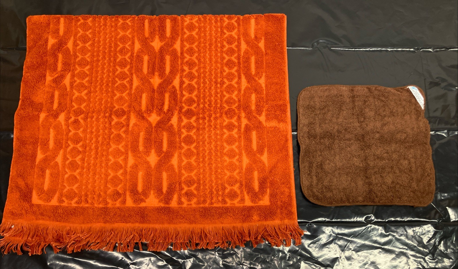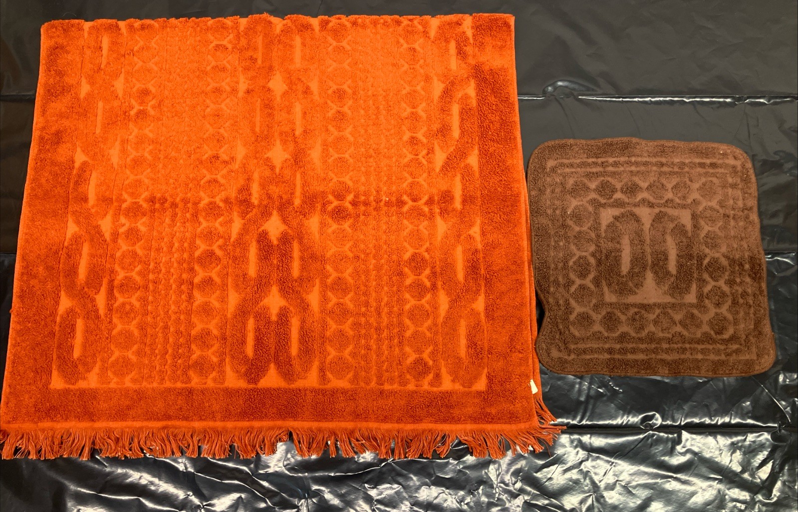 Fieldcrest Orange Bath Towel and Brown Washcloth set retro-themed design with a textured oval patterncotton-polyester blendset includes a bath towel and washcloth bath towel still has original tag pinned to itwashcloth is new without tagmeasurements are in the photosplease view all photosThank you for shopping with me on ebay