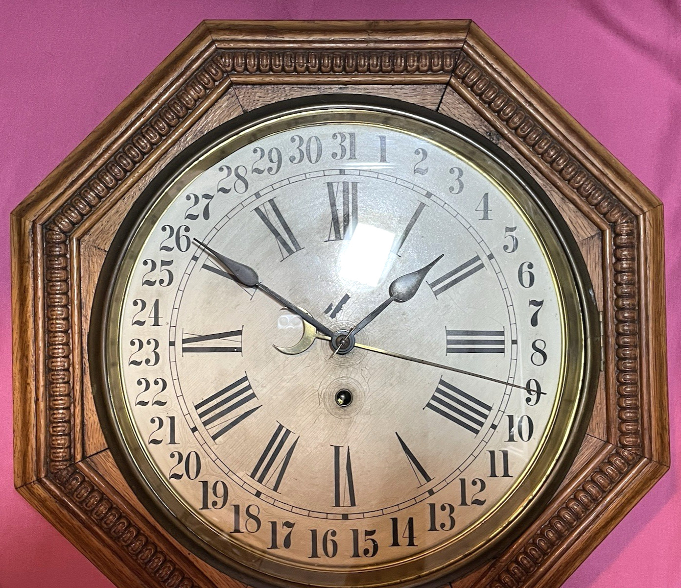 Waterbury Clock Co. Oak Schoolhouse Wall Clock Calendar Short Drop