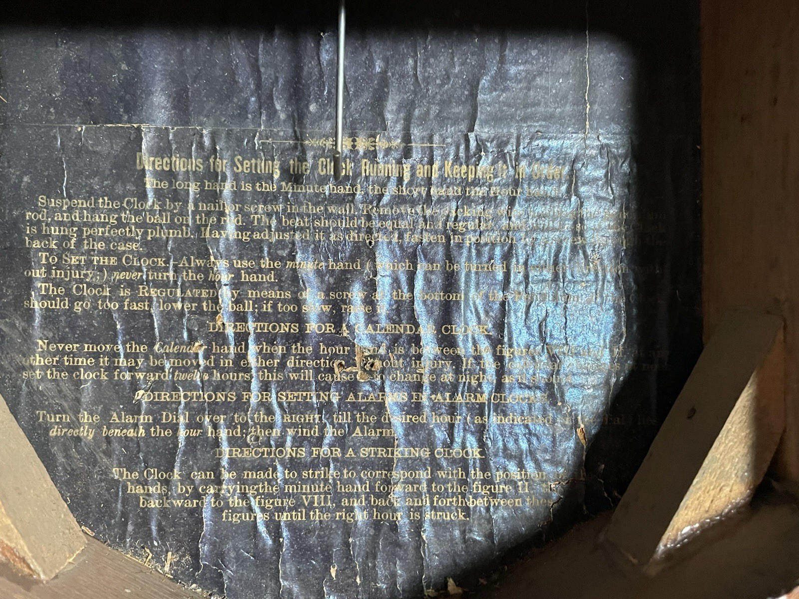 ANTIQUE WATERBURY CLOCK CO. SHORT DROP CALENDAR OAK SCHOOLHOUSE WALL CLOCK RUNS PLEASE READ MY TERMS BEFORE BIDDING: Please familiarize yourself with the Shipping and Handling costs before bidding. I usually ship USPS Priority Mail. Larger, heavier items are usually sent UPS or FedEx. Post cards and smaller, lighter items will be shipped First Class Mail or Ground Advantage and will not include tracking unless value is over $20.00. I do not profit on Shipping and if eBay's shipping calculator overcharges for shipping I will refund the difference through ebay's refund system. I strive to provide you with safe, fast, efficient service so that you receive your item quickly and undamaged. Your 5 star ratings are always appreciated. Payment must be received within 4 days of auction close or sale may be voided at seller's option. Winning bidder will be invoiced promptly after auction ends with contact and payment information. Absolutely no partial refunds given. ABSOLUTELY NO PARTIAL REFUNDS!!!! Thanks for looking and GOOD LUCK! ITEM DESCRIPTION This offering is for a ANTIQUE WATERBURY CLOCK CO. SHORT DROP CALENDAR OAK SCHOOLHOUSE WALL CLOCK RUNS. This 8-Day Calendar clock is in generally very good as found condition. Clock is functional but there is no correct pendulum. Moving the crutch back and forth activates the minute hand and it moves forward as it is supposed to. I hung a small bob on the hook and the clock did run. Rotating the minute hand through a 24 hour sequence activated the calendar hand and it advanced near the midnight hour to the next date. Movement is marked Waterbury Clock Co.; it is relatively clean and the spring is good. Hands are original. Partial bit of original label on back has the letter W. No extra holes so I believe the movement is original to the case. Measures 23-5/8" high by 17" wide by 4-1/8" deep. Painted dial is 11-1/4" in diameter. Bezel is 13" in diameter. Weight before packing is nearly 9 pounds. I will include a key for winding the clock. PLEASE VIEW AND ENLARGE ALL PHOTOS TO DETERMINE IF THIS ITEM MIGHT SUIT YOUR NEEDS. Please take a few moments to read the short terms section above before bidding. By bidding in this auction you are agreeing to the terms above. This is a No Reserve Auction. Please feel free to contact me before bidding if you have any questions.