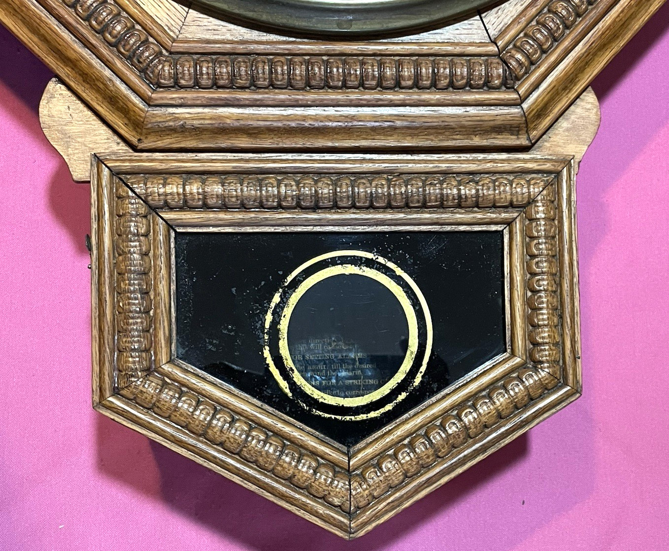 This antique Waterbury Clock Co. short drop calendar oak schoolhouse wall clock is in generally very good as-found condition. The clock is functional but does not include the correct pendulum; a small bob was used to test that it runs. The movement is marked Waterbury Clock Co., appears relatively clean, and the spring is reported good. Original hands are present, and the calendar hand advances when the minute hand is rotated through a 24-hour cycle. A winding key is included. Free shipping is provided; check the listing for packing and carrier details.