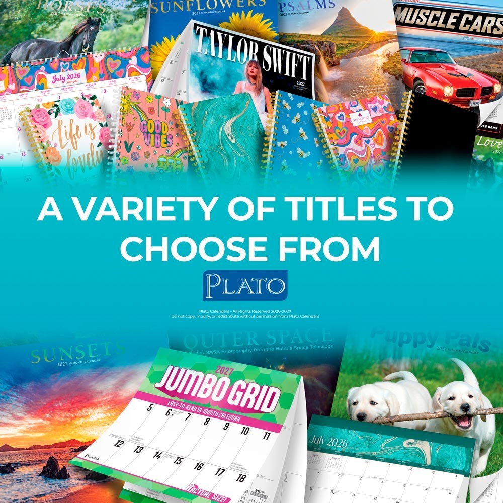 size is ideal for displaying on a wall with the included wire loop hanger, while also offering the option to be smoothly folded flat on a desktop. The beautiful design will bring style to your space, all while helping you to stay organized through 18 consecutive months, from July to December of the first year, continuing with January to December of the next year. Each calendar includes a StickerIt™ sheet of customizable and movable stickers that fulfill your unique needs and accommodate life's changes.StickerIt™ Stickers – Customizable in a variety of shapes and colors to help categorize and highlight important dates and appointments, easily movable to new datesSleek Design – Enjoy a stylish, professional design every monthFlip-Over Layout – Wire-O binding allows pages to be flipped over, using half the space of standard calendarsUse Right Away – 18-month calendar, starting in July of 2026Versatility – Ideal for hanging on the wall or for use on your desktopDurable Construction – Sturdy, high-quality paper resists curling and ink bleed-through, and durable binding ensures longevity throughout the yearLarge, Roomy Day Blocks – All major holidays and moon phases listed, with plenty of room for writing notes and appointmentsSpecifications – 18 months (July 2026–December 2027); 12" x 12"; 18 pagesPlato Earth-Friendly – Manufactured with sustainable materials, including Forest Stewardship Council®-certified paper and soy inkAbundant Gift Options – Plato has a variety of calendars featuring popular subjects and themes in various formats to keep you organized