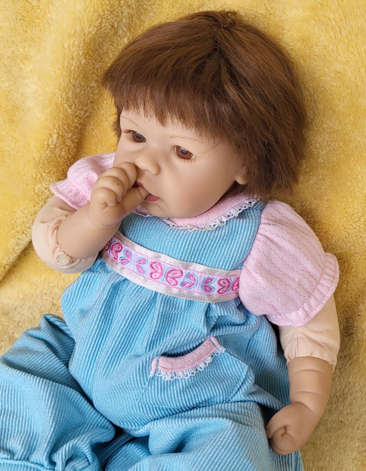 Selling a Lee Middleton Reva Doll SKYLAR Thumb sucker 2002 DOLL shows a soil on the leg.May need eyelashes.