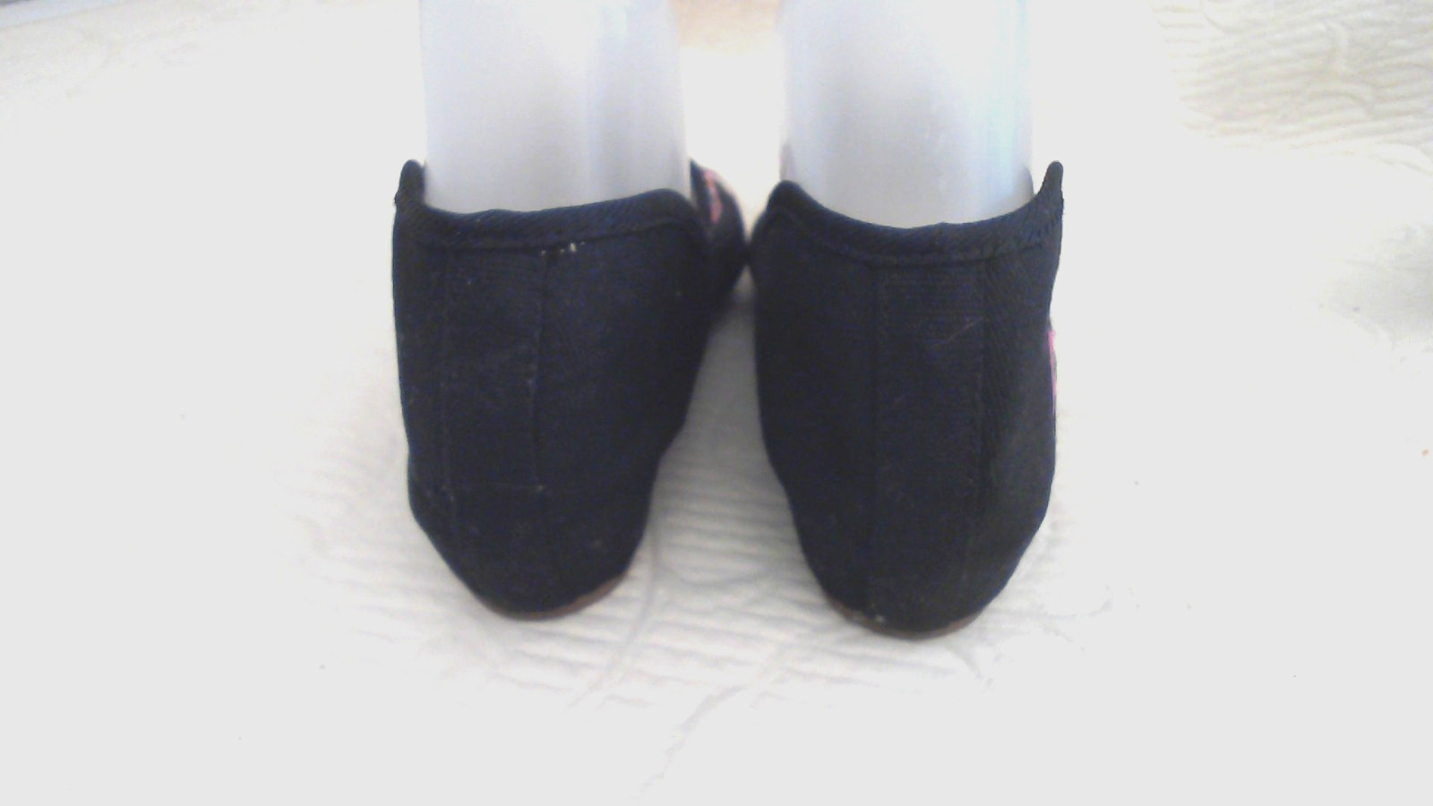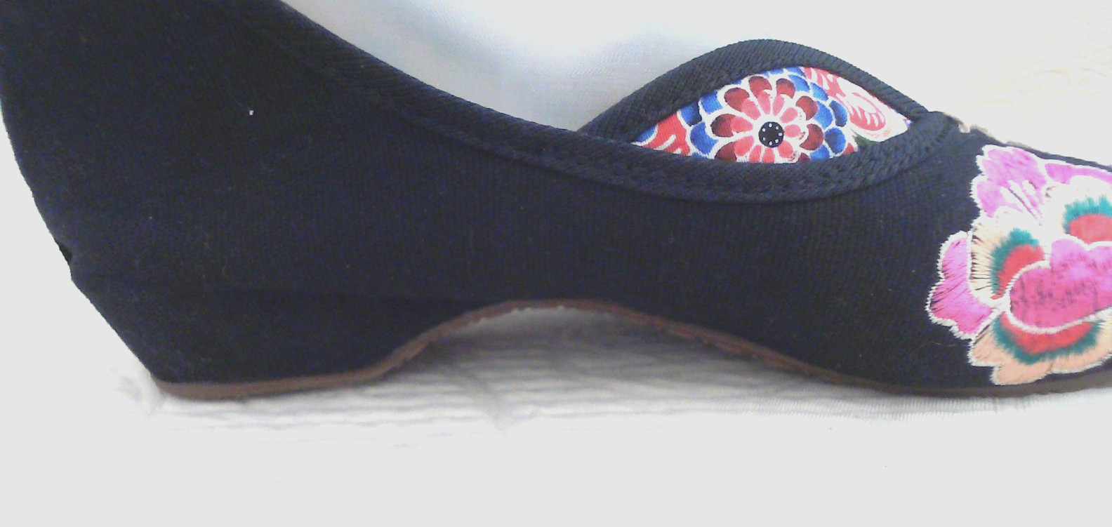 Very nice black canvas embroidery shoes with dragon embroidery on one side and rose or floral on the other side. They appear to be a cotton canvas material on the outside, no lining. The footbed area has a padded foam insert. They are called flats but the back heel is 1.25" high and the bottoms are rubber textured for slip resistance. They are a US Size 9 EURO 40. They would be a M or B width. The embroidery on the shoes is gorgeous. I do not know how durable they would be, but I did try them on and they feel very comfortable. Would wear them for special occasions with special outfits to bring out the colors. Very attractive. Weight: 11 oz unpackaged.*Will ship in a vinyl mailer.USA Seller....................Happy Shopping Always....................
