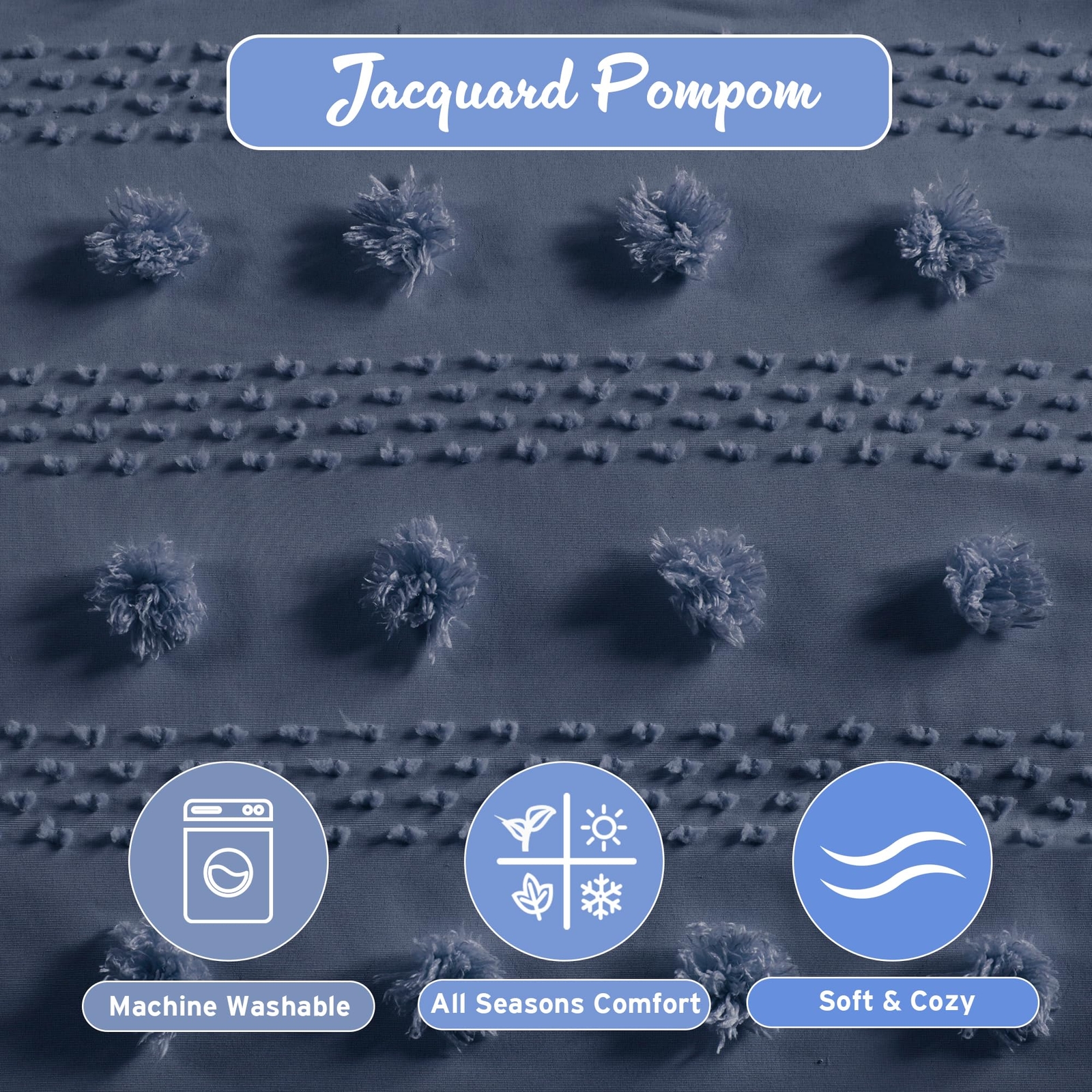 Refresh your bedroom with the elegant style of 's Lucy Clip Jacquard Comforter Set. This beautiful comforter features fun and playful clip jacquard pompoms all over the face that add dimension to the top of the bed for a lovely look. The matching shams (1 in Twin/TwinXL) also flaunt the delicate design of the comforter to complete the jacquard bedding set. Machine washable for easy care, this elegant comforter set is OEKO-TEX certified, meaning it does not contain any harmful substances or chemicals to ensure quality comfort and wellness. Items may come in rolled or compressed packing and will need to be fluffed up. Use a steam iron to help remove wrinkles easier.Comfortably Cozy: Our Twin-sized navy blue comforter is made with brushed microfiber and skin friendly down alternative fill. It's exceptionally soft, comfortable, breathable, and long-lasting, offering the warmth and comfort you've been seekingChic Textural Bedding Décor: Elevate your space with chic and trendy bedding adorned with clipped jacquard and charming pompom details. These modern additions bring texture and depth to your decor, providing a stylish update to your bedroom décorAll Season Bedding - Enjoy year-round comfort with our all-season bedding. Crafted from soft, lightweight, and breathable brushed microfiber, this versatile and fluffy comforter keeps you cozy for a restful night's sleep in any seasonPackage Includes: Twin/Twin XL Comforter 68"W x 90"L (1) Matching Standard Sham 20"W x 26"L + 2"D (1). Oeko-Tex certified for for superior COMFORT and WELLNESS, as they are free from any substances or chemicals that may compromise qualityEasy Maintenance: Our Twin