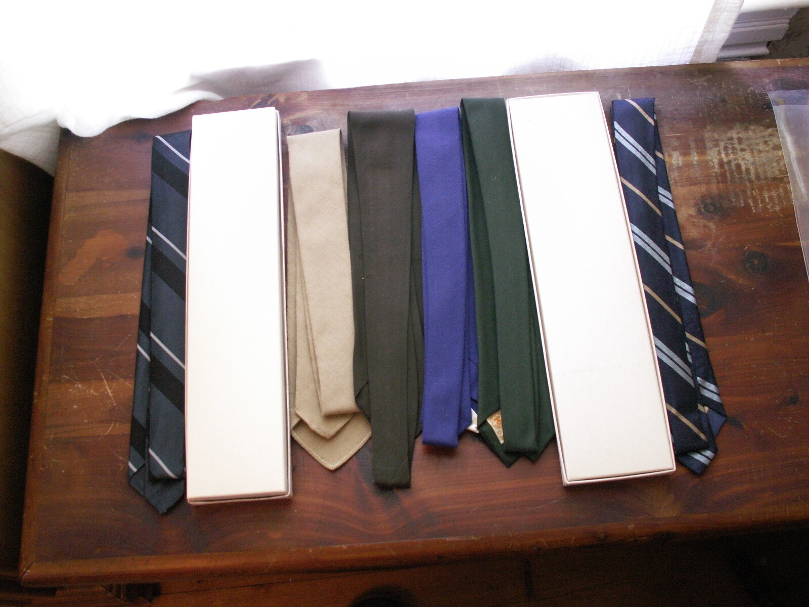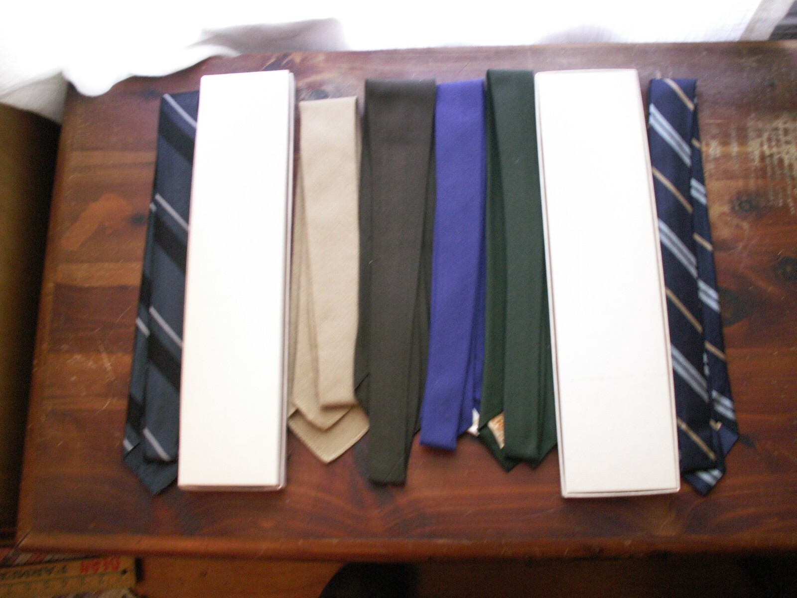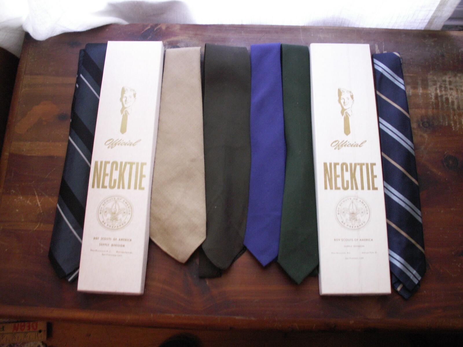 4 Boy Scout neckties....2 boxes....2 ties that were with these.......unknown to me if they are boy scout or not...so a total of 8 pieces.....two ties have boys scout labels...light tan tie has several black stamps inside maybe H7074 .........please view all photos.....guessing 1960's on this lot but really don't know.