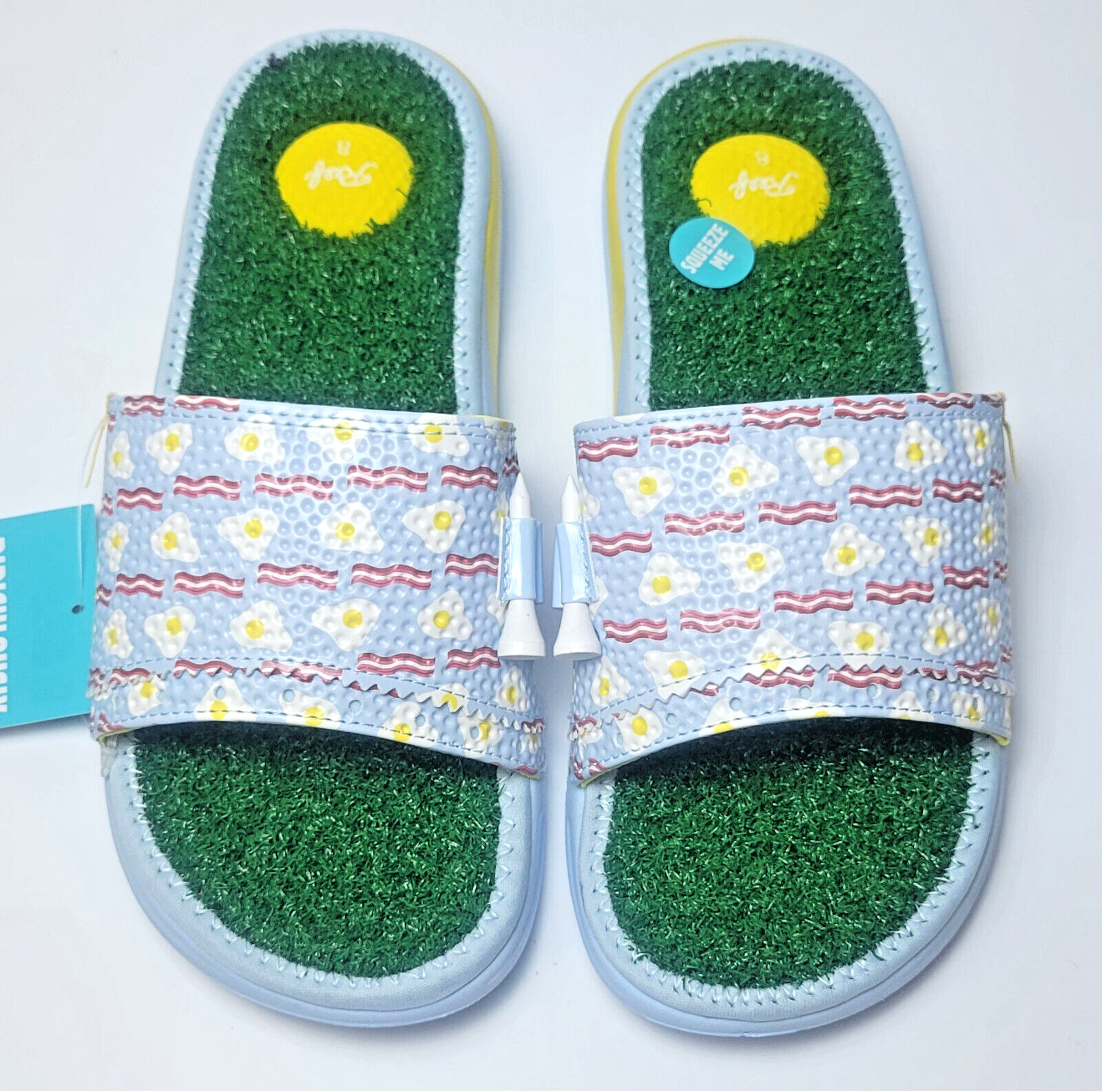 This is one decision you will not want to do over! The faux grass footbed, the golf ball heel pad, the built-in tee and the non-injection molded durable foam outsole -- it's a hole in one. Perfect for the locker room or grabbing that round of drinks after your round.FeaturesUpper: Golf ball inspired synthetic leather with golf tee holderFootbed: Faux grass footbed with golf ball heel padOutsole: Non-Marking injection molded EVALightweightVegan LeatherPlease note New with Box means A brand-new, unused, and unworn item (including handmade items) in the original packaging such as the original box OR bag and/OR with the original tags attached. Most thong Flip Flop sandals do not come in a box, they come with the original tags attached We only sell brand new unused merchandise unless otherwise posted. Just like all websites we use one picture for all sizes. The picture is for visual presentation of the style and does not represent the size. Please refer to title and item