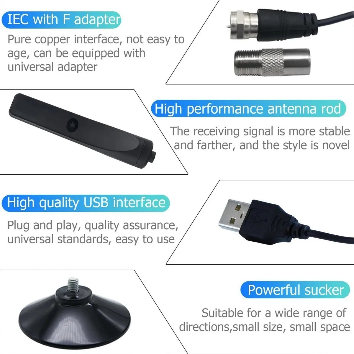 specificationsAntenna 3.0m net weight: 85g( 1 )support 1080p hd mode( 2 )50 miles range(3) coaxial cable: 3.0m length Add booster 0.65cm(4) connector type: tv head with f adapter.(5) v.s.w.r.: < = 1.5, max: 1( 6 )impedance: 75 ohm(7) multi-directional capability(8) can receive all “free to air” channels( 9 ) gain: 25dbi(10) standard antenna board colors are available in black.(12) working frequency: 174~240mhz, 470~862mhz(13) product