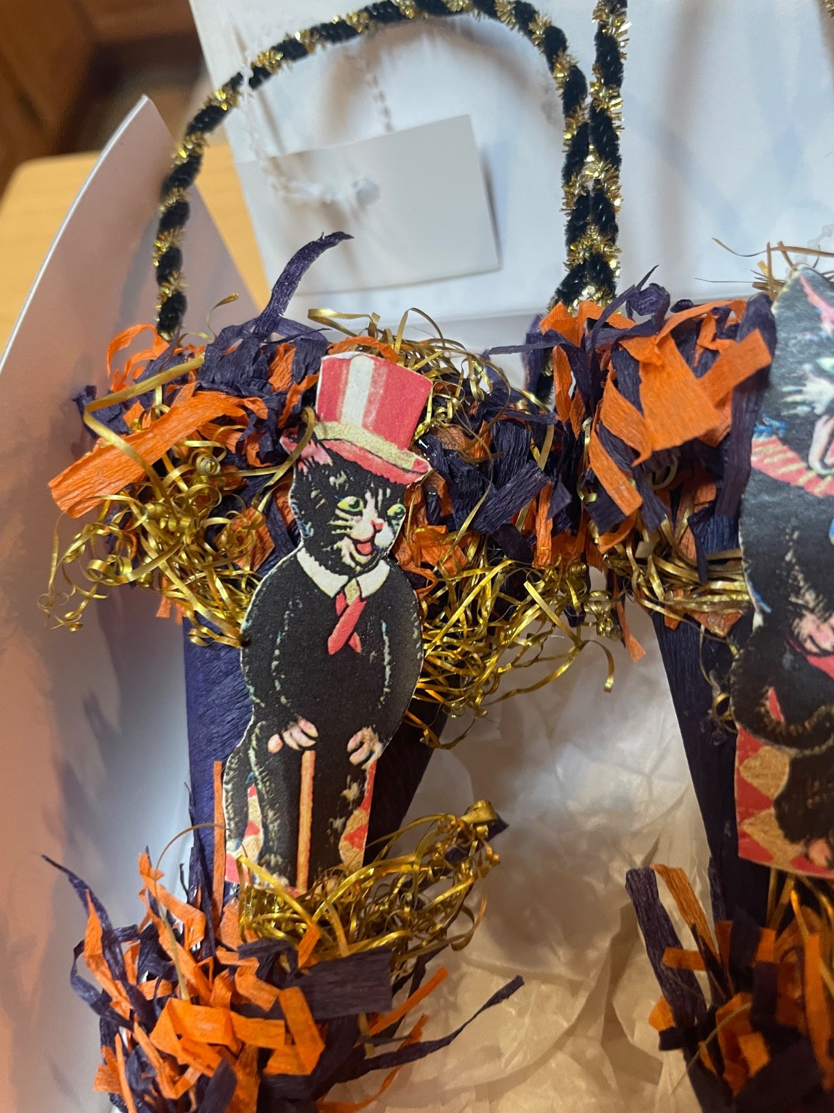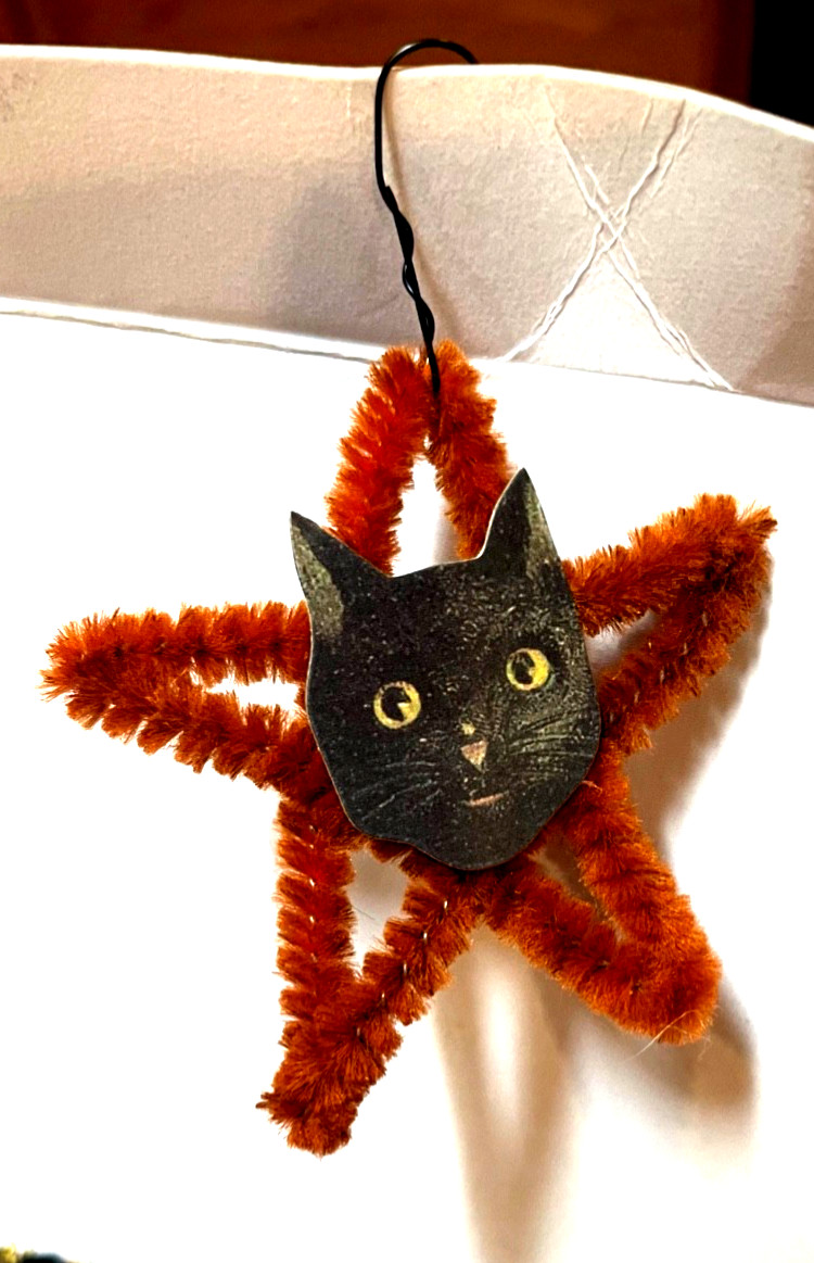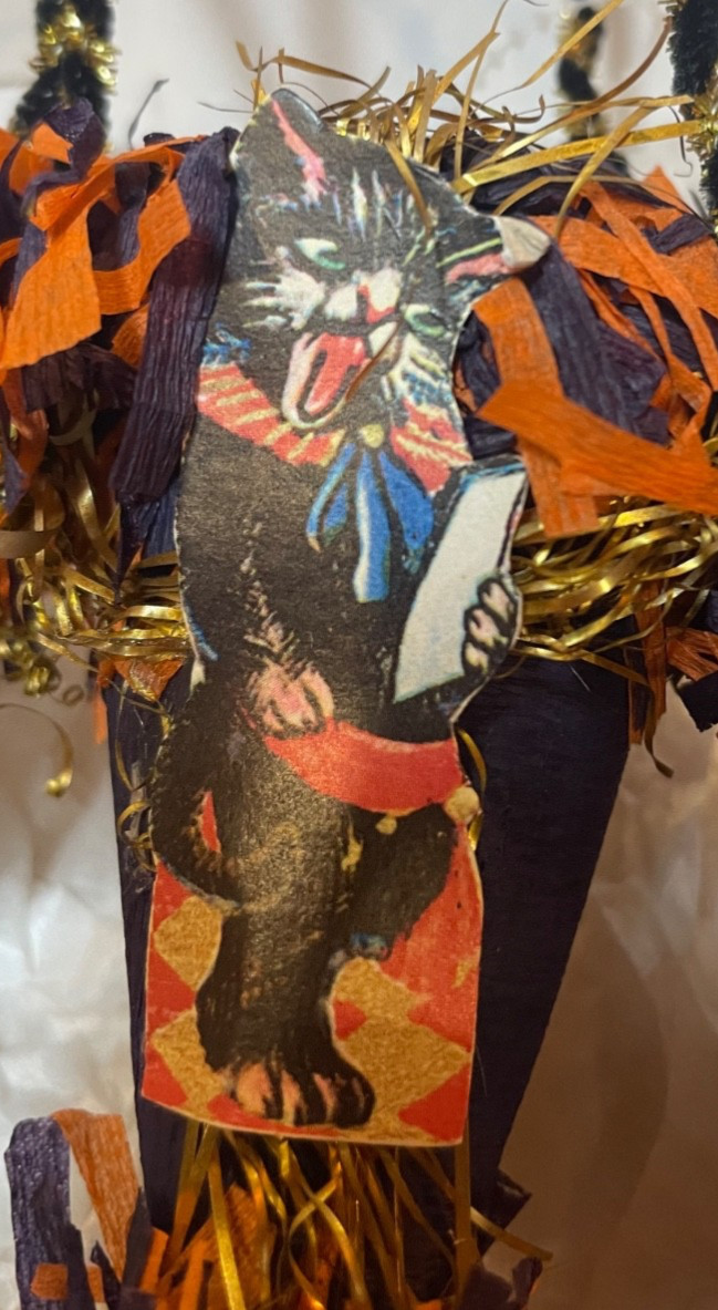 The Bethany Lowe Gail and Glenn Giaimo Dresden Star Heirloom Halloween Ornaments are a charming set of ornaments featuring a playful cat pattern. Made from mixed materials and crafted in the early 2000s, these multicolored ornaments come in a box for easy storage and display. Perfect for adding a whimsical touch to your holiday décor, especially during Halloween, these ornaments are a delightful collectible item for cat lovers and ornament enthusiasts alike.