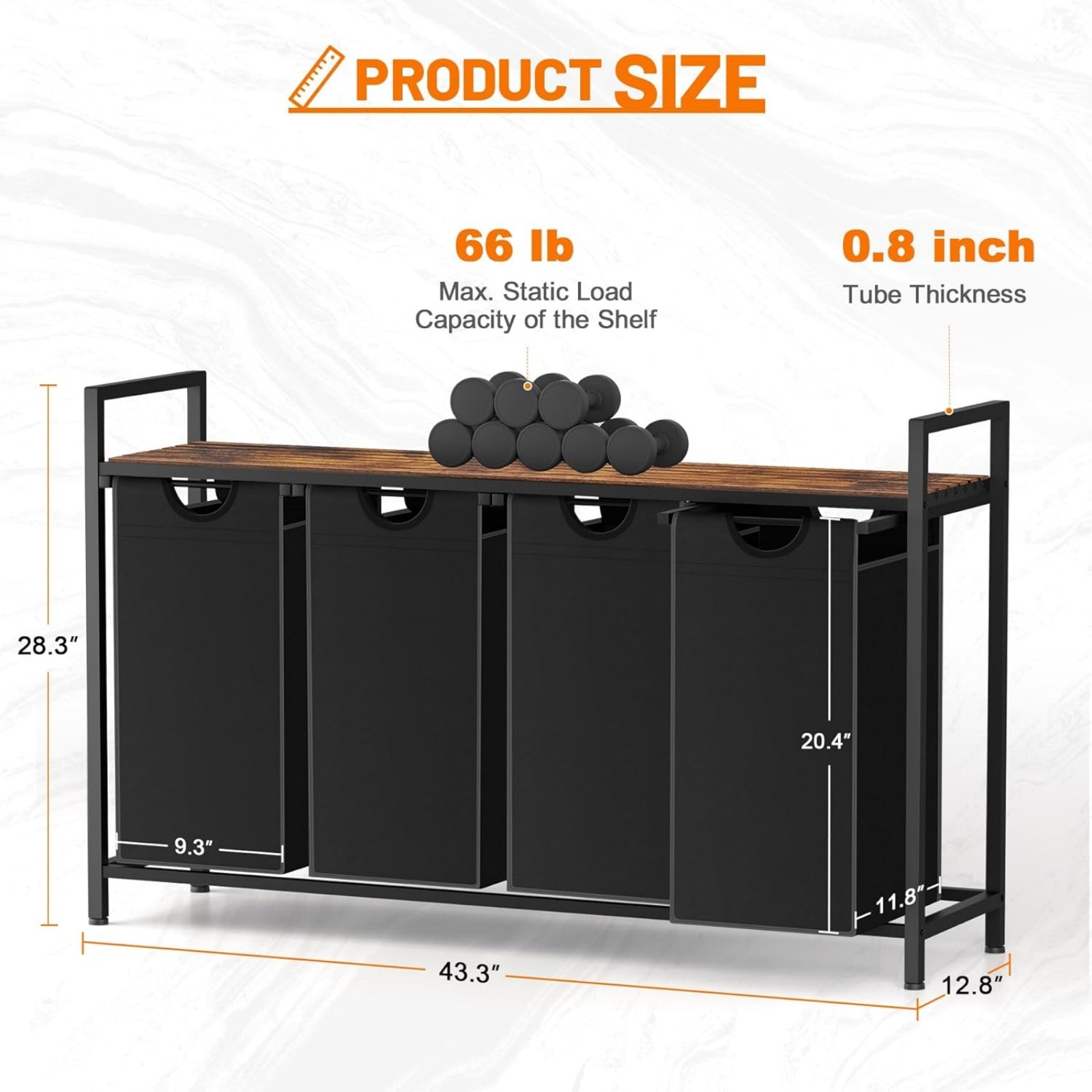 size of laundry basket is 43.3"D x12.8"W x 28.3"H. The laundry basket comes with a detailed instruction manual and all necessary tools and screws. Versatile Applications - This clothes hamper includes a removable bag secured with hook-and-loop fasteners, offering endless possibilities for reuse as a toy organizer, storage pouch, or beyond! Sturdye and Durable - Our laundry hamper features a sturdy metal frame capable of supporting up to 66 lbs without bending, ensuring durable strength for daily use. > > table img Laundry Hamper Sorter Basket Black with 4 Pull-Out Removable Oxford Fabric Bags Easy Assembly - The