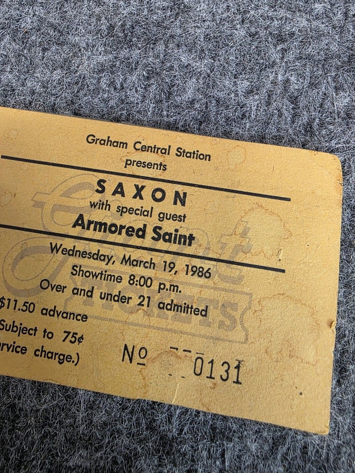 This is an original concert ticket for a live performance presented by Graham Central Station featuring Saxon with special guest Armored Saint. The event took place on Wednesday, March 19, 1986, with a showtime of 8:00 p.m. The ticket admits both over and under 21 attendees. The advance price was $11.50, subject to a 75¢ service charge. The ticket number is 0131. This ticket is a paper substrate with black printed text on a yellow background, showing some visible wear and tape residue on the back.Specifications:- Brand/Maker: Graham Central Station- Event: Saxon concert with special guest Armored Saint- Date: Wednesday, March 19, 1986- Showtime: 8:00 p.m.- Admission: Over and under 21 admitted- Price: $11.50 advance (plus 75¢ service charge)- Ticket Number: 0131- Material: Paper- Original packaging: None shownThis ticket is a collectible piece of music history from the mid-1980s metal and rock scene, ideal for collectors of vintage concert memorabilia, music fans, and those interested in Saxon or Armored Saint tour artifacts.