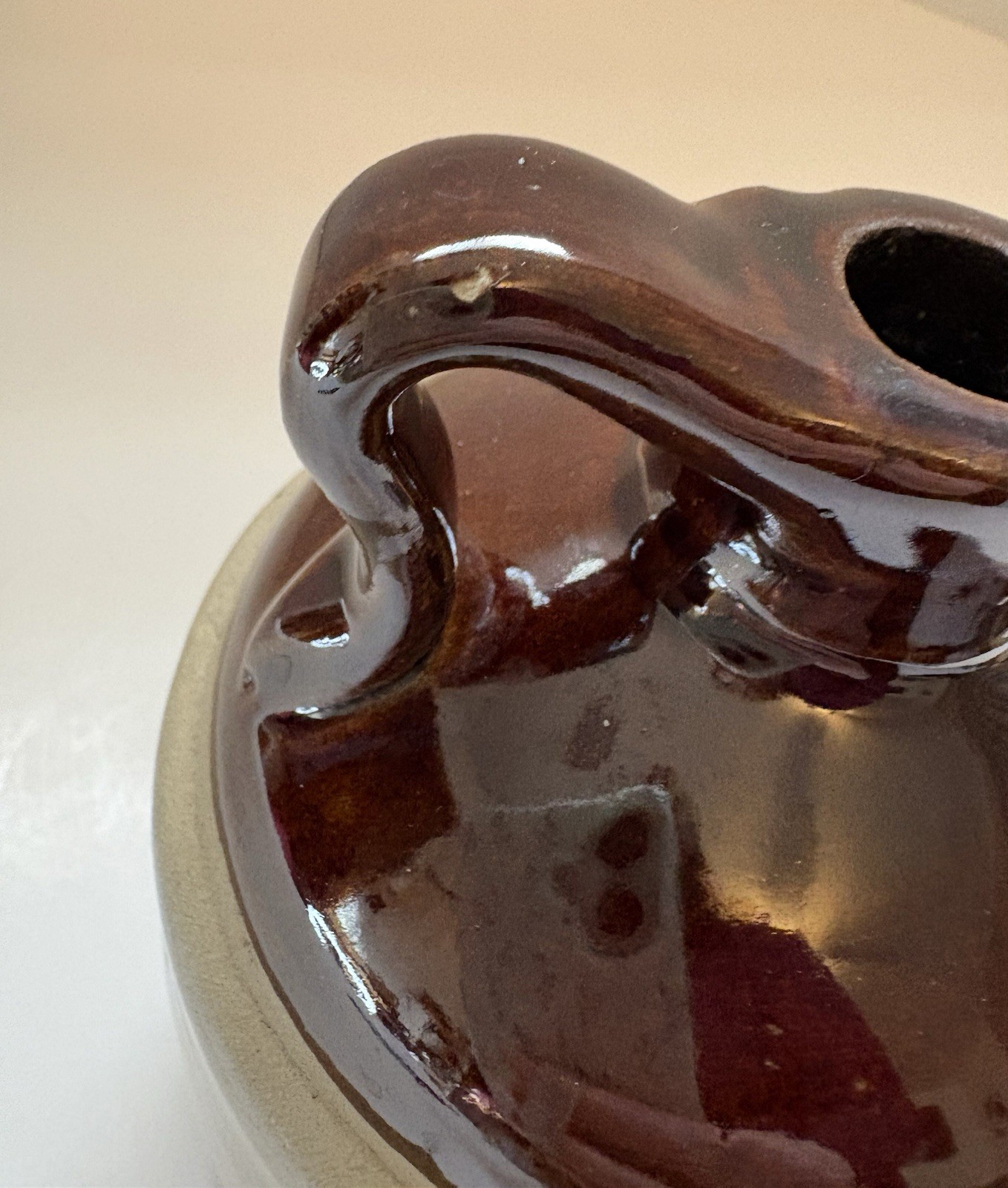This is a Vintage Crock with Ehrle Bros. Winery Amana Colonies 4/5 QT. from 1973 stamped on the front. It is in very good condition.There is a tiny spot on the handle that may have been there since it was made. Please refer to the photos for that close up along with the rest for condition. There is no cork or stopper. 4" diameter across bottom, 6.5" tall.