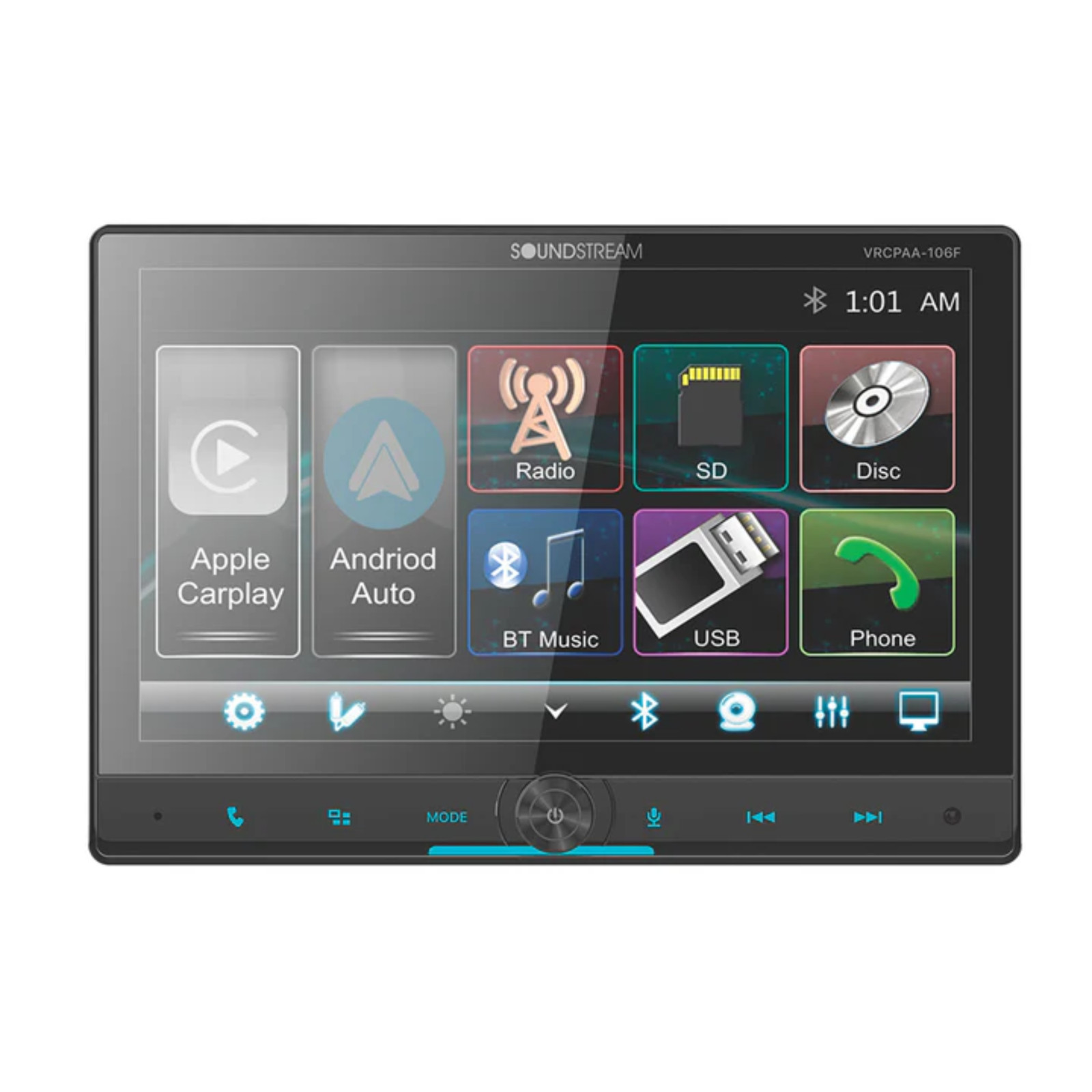 WELCOME TO DISCOUNT CENTRAL ONLINEBusiness hours: Monday - Friday 9am - 5pm / Saturday, Sunday and Holidays we are Closed. Technical Details:Soundstream Floating 10.6″ Multimedia Touchscreen Car Head Unit with Apple CarPlay & Android AutoModel: VRCPAA-106F10.6" floating HD touchscreen headunit with 1280×720 resolutionISO 2-DIN chassis fits most 2010-2023 Chrysler/Dodge/Jeep vehiclesWireless Apple CarPlay (adapter required) with Siri Eyes FreeWired Android Auto with Google Assistant voice controlDVD/CD player + Dual USB 2.0 ports (front/rear) + 128GB microSD supportAdvanced FM/AM tuner with RDS/RBDS station info displayIncluded wireless remote for rear-seat control10-band graphic equalizer with 8 preset modes (Rock/Pop/Jazz)Dual camera inputs (front/rear) with +12V auto-on triggerBluetooth 5.0 Wireless ConnectivityHands-Free Profile (HFP 1.6) with noise cancellationPhone Book Access (PBAP) syncs 2000+ contactsAVRCP 1.6 controls Spotify/Apple Music playbackA2DP streaming with aptX audio enhancementDynamic User Interface10.6" motorized TFT-LCD with 178° viewing angleGlove-friendly capacitive touchscreen with SmartSenseSplit-screen display for navigation + media7-