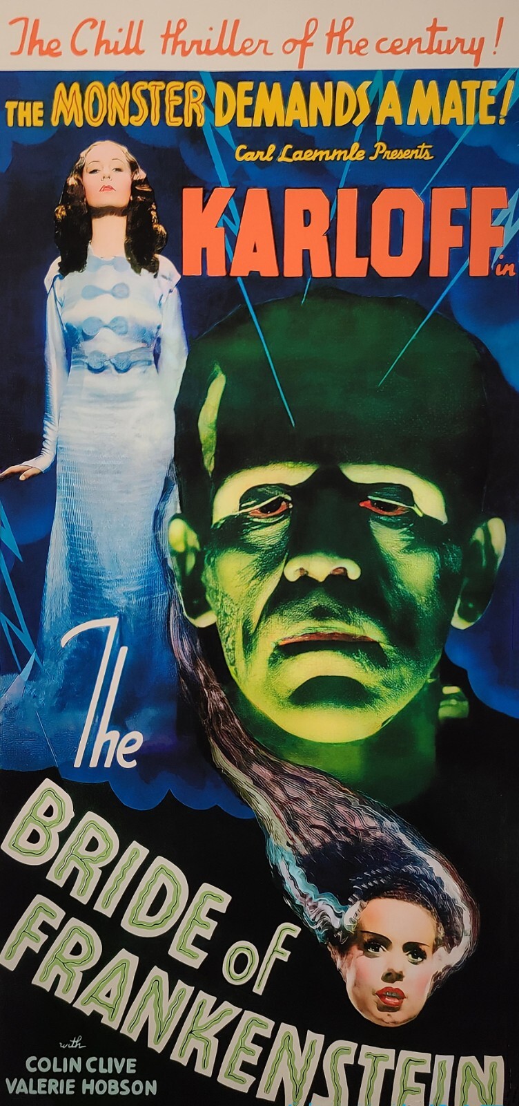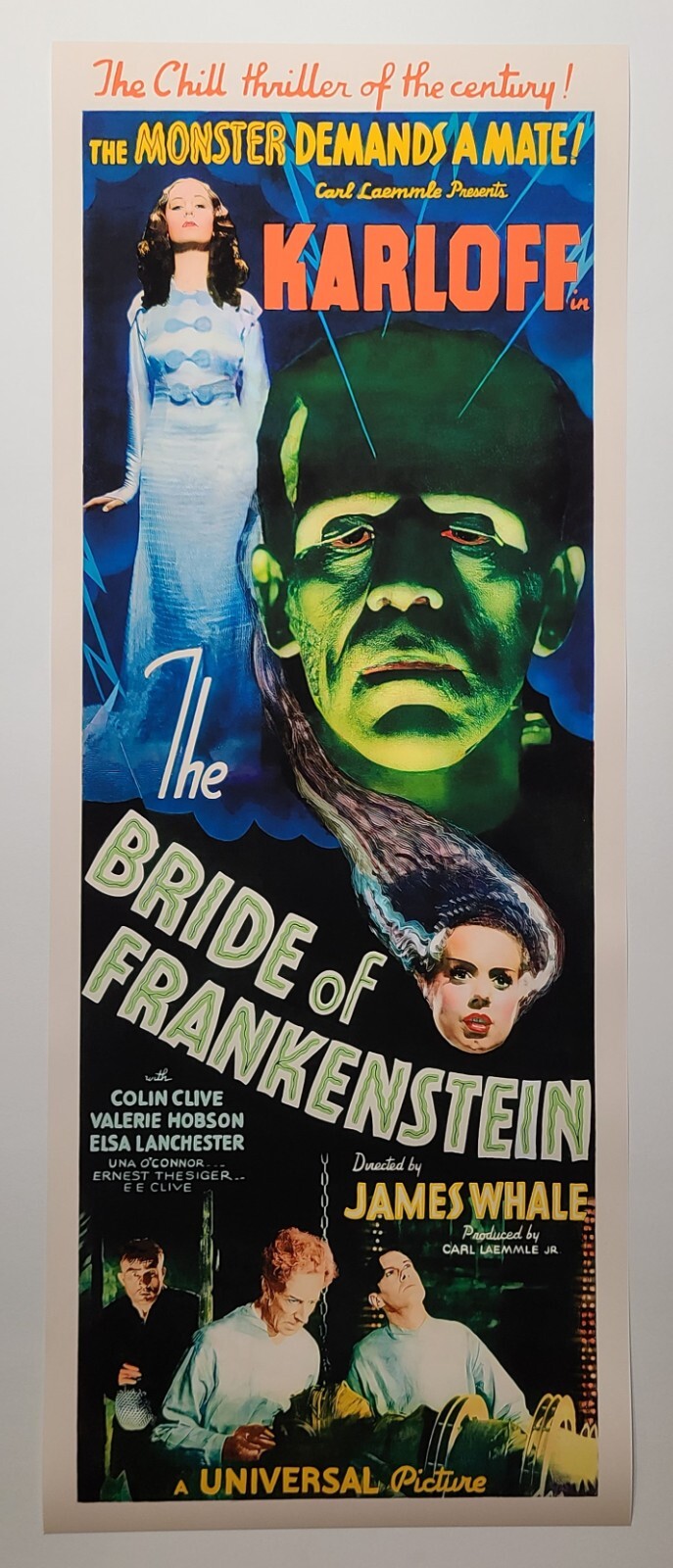 "Bride of Frankenstein" 1935 Universal Insert 14" X 36" Reproduction Poster Printed on enhanced matte paper with archival inks. Overall print has a very flat look from the ink to the paper for that vintage look. Paper is a thick 10 mil matte paper printed with archival inks, this is not the glossy reprints you see all over Ebay. The photos in all of my ads are of the actual printed poster. Perfect