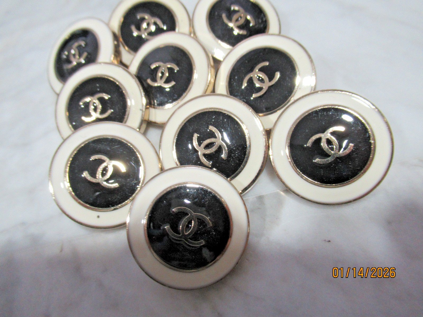 10 CHANEL BUTTONS GOLD METAL , BLACK , WHITEGOLD TONE CC LOGO20MM/ a