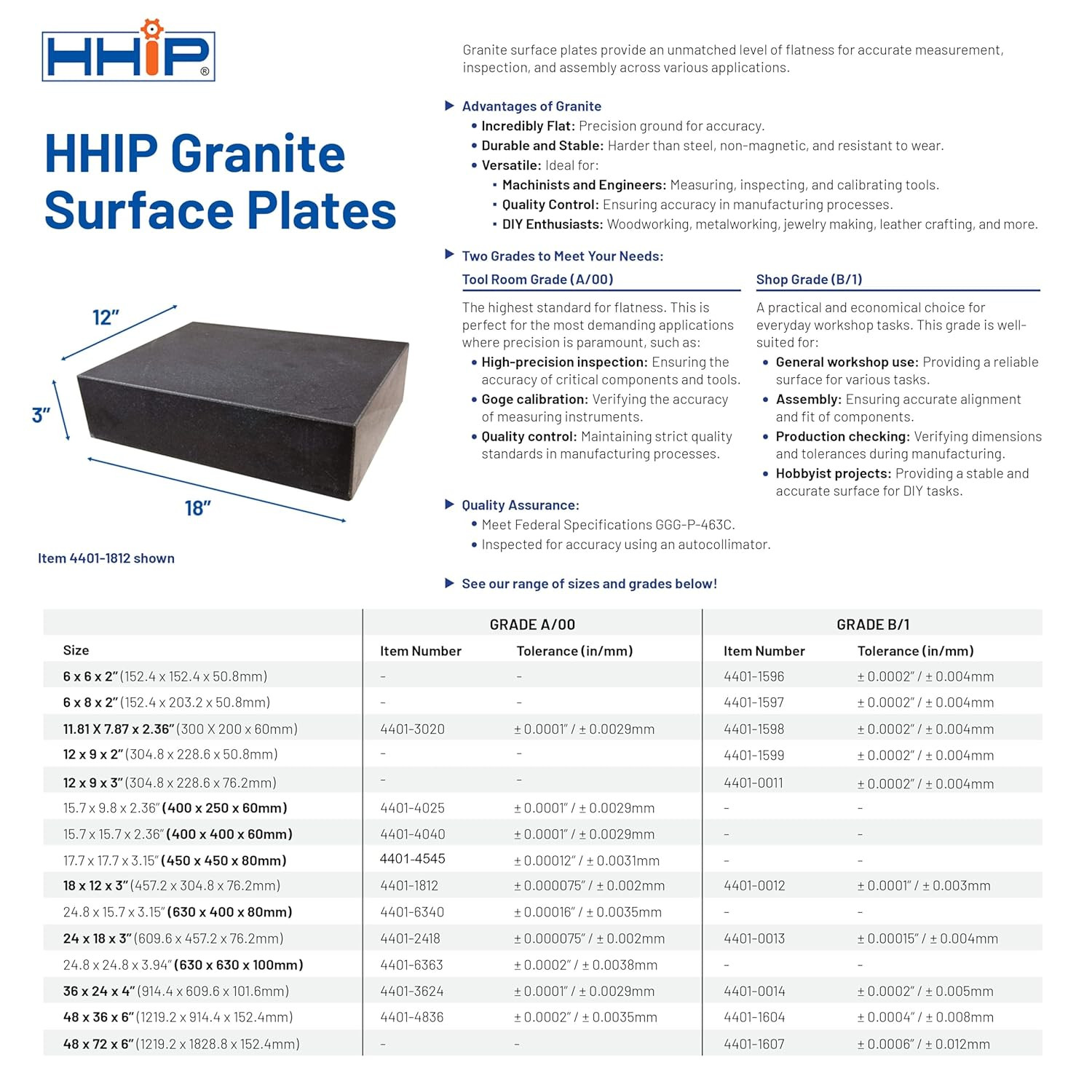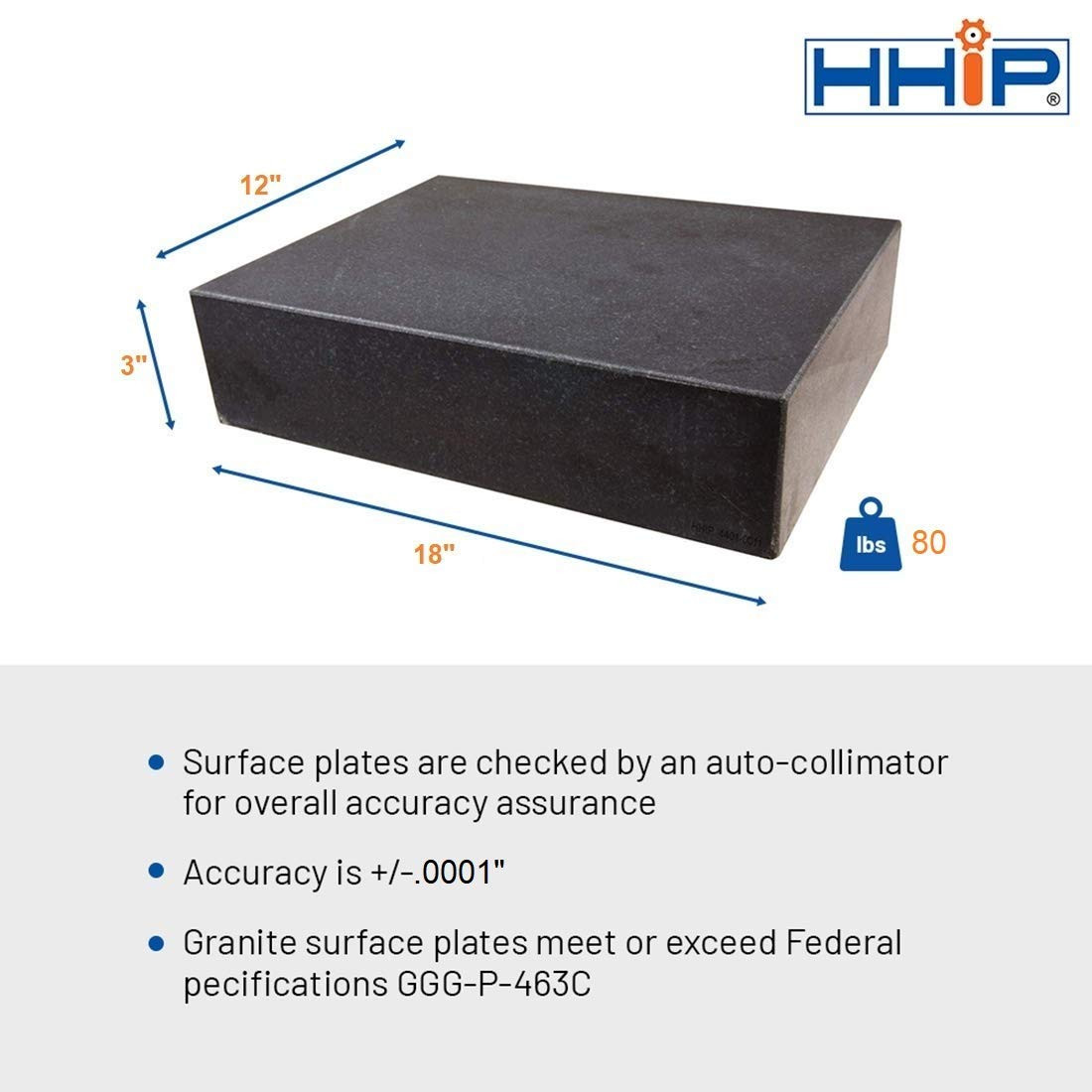The top surface of this plate is precision ground to achieve a high degree of flatness and the accuracy is 0001". It is a Grade B (Grade 1) plate.Granite surface plates meet or exceed Federal Specifications GGG-P-463C and it includes a certificate of inspection. (Note that these are not NIST traceable.)Granite plates are used for measuring the flatness and squareness of other objects, laying out parts, calibrating instruments, setting up tools, checking parallelism and perpendicularity, and measuring heights with the use of a height gage.They are also used as a work surface for assembling, inspecting, and marking parts. Non-magnetic and non-conductive. Harder than steel and does not nick or burr.Surface plates are offered by HHIP in various sizes, with different levels of flatness and accuracy and are checked by an auto collimator for overall accuracy assurance. HHIP 18 x 12 x 3 Granite Surface Plate Grade B Ledge 0 The top surface of this plate is precision ground to achieve a high degree of flatness and the accuracy is 0001". It is a Grade B (Grade 1) plate. Granite surface plates meet or exceed Federal Specifications GGG-P-463C and it includes a certificate of inspection. (Note that these are not NIST traceable.) Granite plates are used for measuring the flatness and squareness of other objects, laying out parts, calibrating instruments, setting up tools, checking parallelism and perpendicularity, and measuring heights with the use of a height gage. They are also used as a work surface for assembling, inspecting, and marking parts. Non-magnetic and non-conductive. Harder than steel and does not nick or burr. Surface plates are offered by HHIP in various sizes, with different levels of flatness and accuracy and are checked by an auto collimator for overall accuracy assurance.