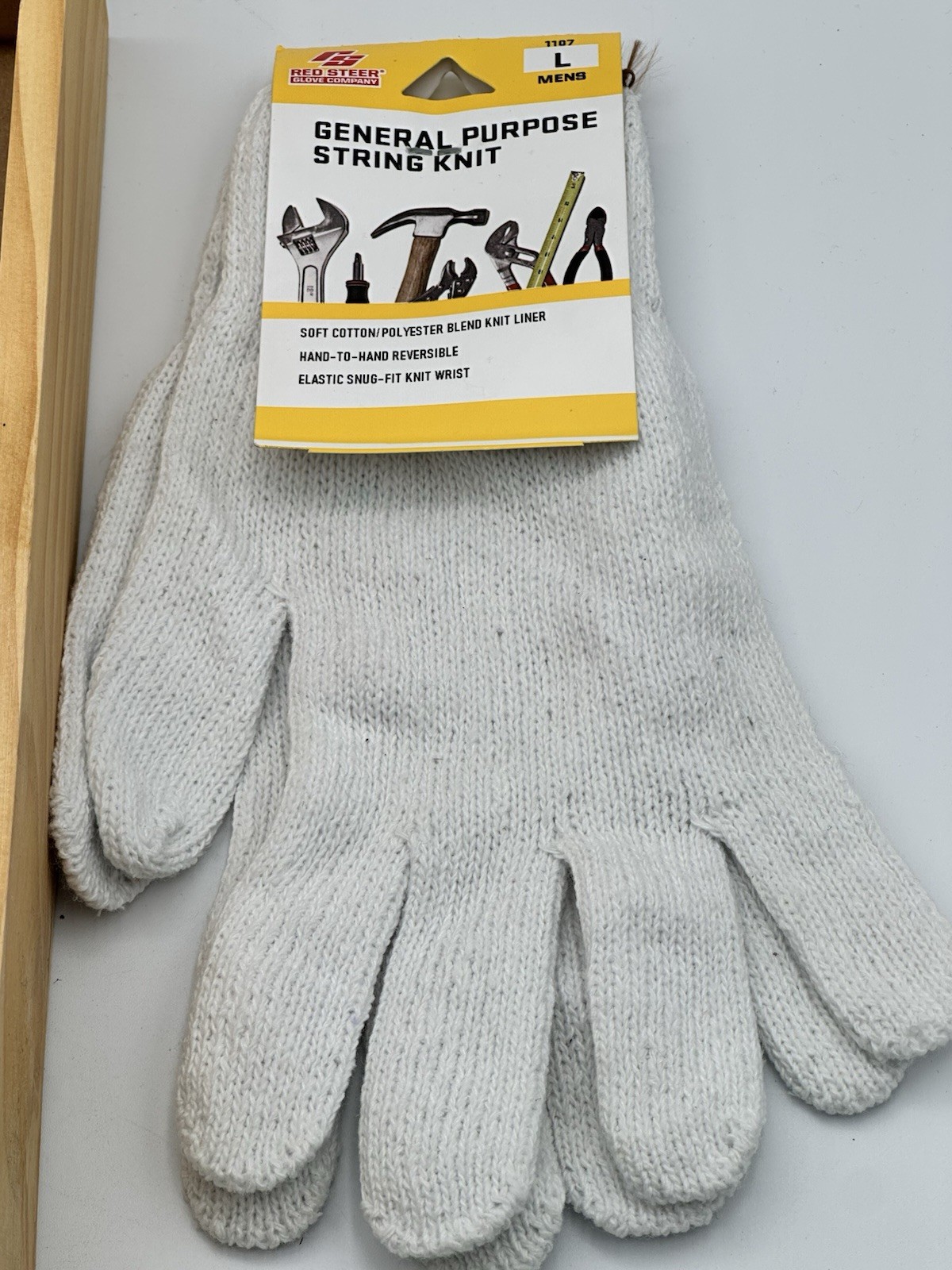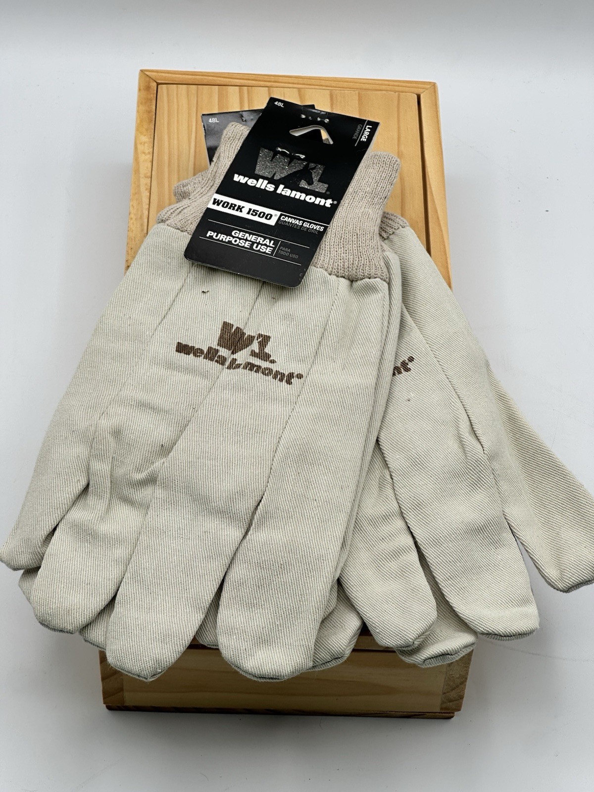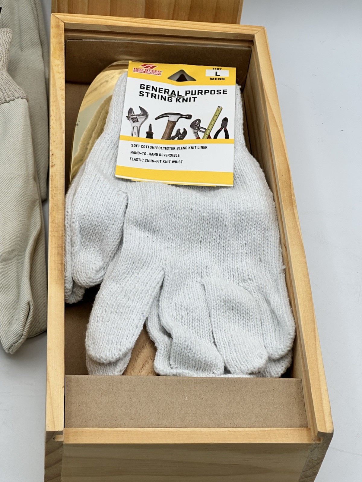New in original wooden gift box trowel and pruner set from 2016 along with three pair of general purpose gloves, all