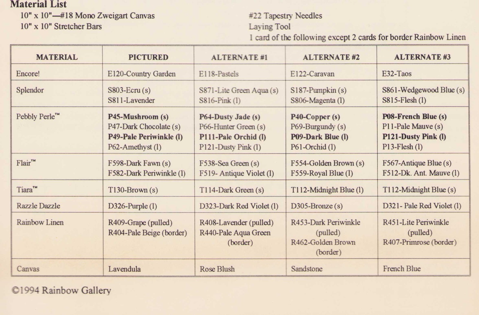 Offered is: Charted Needlepoint Pattern includes 18 Mesh canvas by Zweigart, and threads as shown in picture. OOP (out of print) UNUSED Excellent condition with designs and instructions.Non-smoking home. Stored out of sunlight. No rips, no stains, no bad smells, no perfume smells. I always combine shipping for you as well.More than happy to ship overseas or outside the USA, but shipping costs do not include customs or other applicable fees.***Save my store. I will be adding a LOT of specialty threads!!