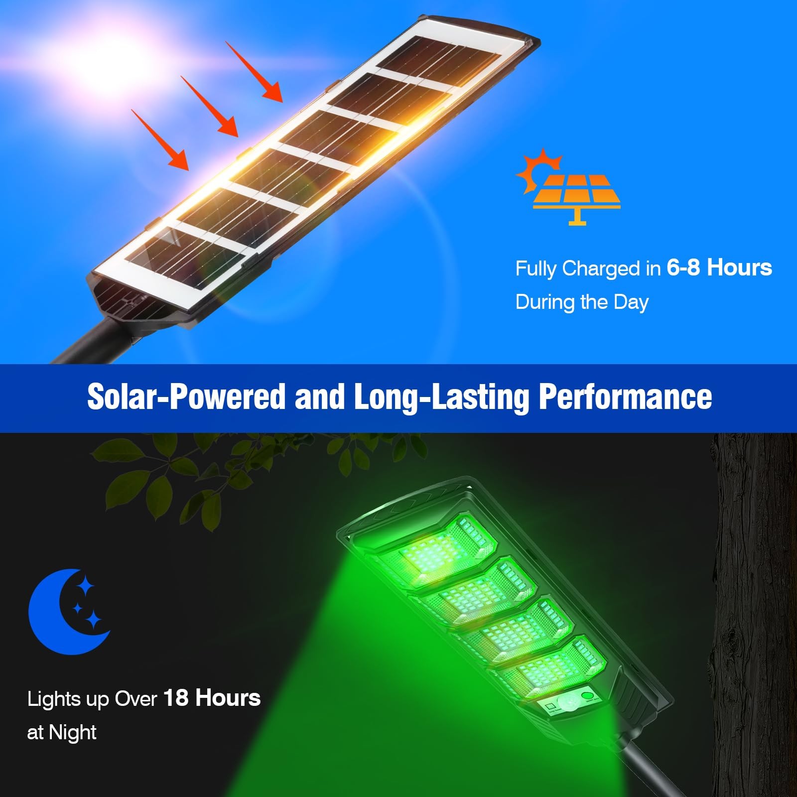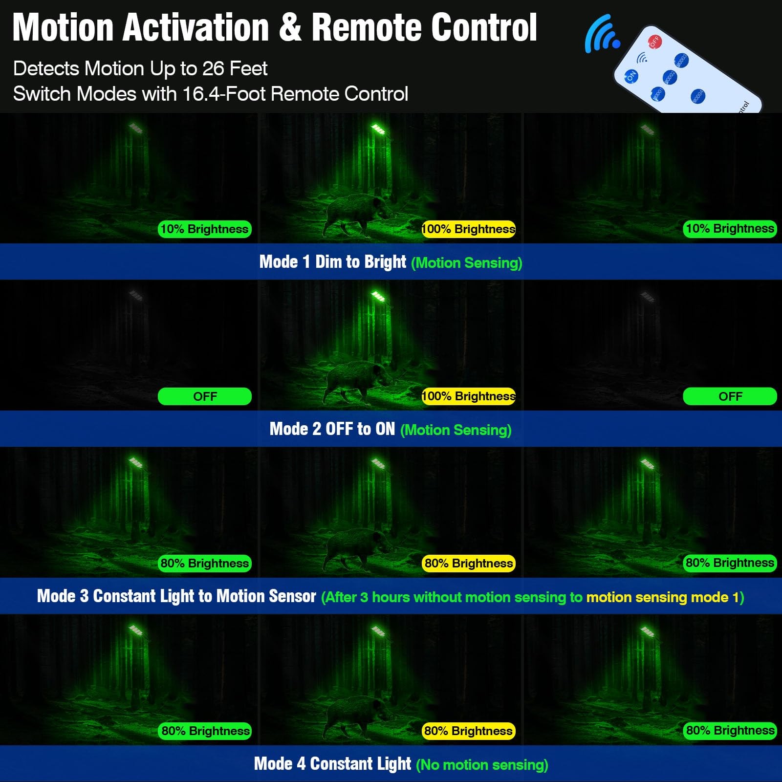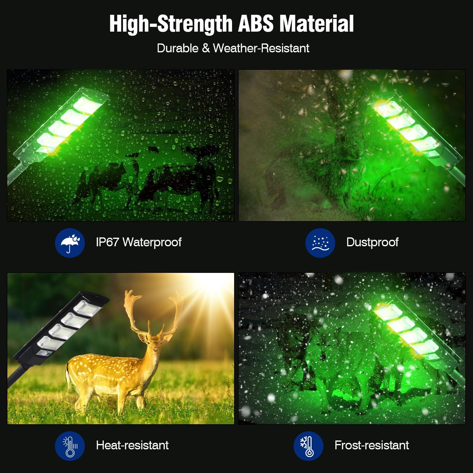 This 12,000-lumen solar-powered hunting light is designed for nighttime hunting, featuring a green light that minimizes disturbance to wildlife. With a coverage area of 860-960 square feet, it offers clear visibility and supports motion detection and remote control for versatile use. It fully charges in 6-8 hours and provides reliable all-night illumination. Built with durable ABS material and an IP67 waterproof rating, it withstands harsh weather, making it perfect for hunting hogs, coyotes, and deer.【Clear Target Illumination】This solar-powered hunting green light features a powerful brightness of up to 12,000 lumens, offering clear visibility of your target. The light covers an area of 860-960 square feet, making it ideal for hunting, feeder, and other outdoor scenarios. For optimal performance, it is recommended to mount the light at a height of 10-14 feet to achieve a broader and more uniform light distribution【Solar-Powered and Long-Lasting Performance】This hunting light is equipped with a high-efficiency solar panel, this light charges quickly even in cloudy or low-light conditions. With its high-capacity lithium battery, it fully charges within 6-8 hours and provides reliable, all-night illumination for your outdoor needs【Motion Activation and Remote Control】This coyote light is equipped with a high-sensitivity motion , it detects movement up to 26 feet in front, automatically switching to high-brightness mode when motion is detected and returning to energy-saving mode after the target leaves. Supports dusk-to-dawn automatic lighting for added convenience.Equipped with a 16.4-foot remote control, allowing easy adjustment of constant light, motion detection, timer, and other 4 modes【Durable and Weather-Resistant】This hog lights is built to withstand harsh conditions, the light is made of high-strength ABS material, providing excellent impact resistance and anti-corrosion capabilities. With an IP67 protection rating, it delivers outstanding waterproof and dustproof performance, ensuring reliable operation in rain, snow, frost, and other extreme weather conditions【The Perfect Tool for Night Hunters】Green light is the top choice for hunting wild hogs, coyotes, and deer, as it is less perceptible to prey and effectively reduces the chances of startling wildlife. The product includes a 1-year quality and 24-hour , ensuring your concerns are addressed promptly