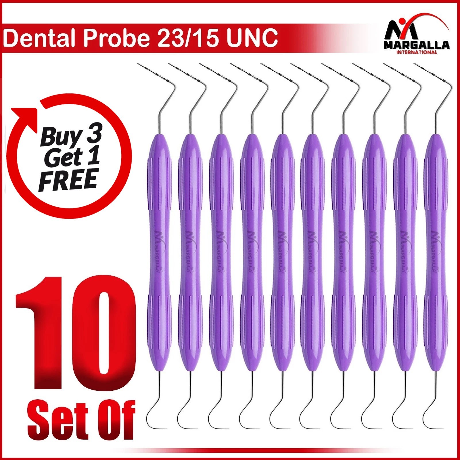 PRODUCT DESCRIPTIONDental Explorer-Probe 23/15UNC Silicone Handle, High Quality Dental InstrumentsPRODUCT FEATURESManufactured from High Quality Medical Grade Stainless Steel.High Degree of Aesthetic and Corrosion Resistance.Fully Autoclavable / ReusableProduct Conforms to ISO 9001, CE-Quality Mark, ISO 13485, and other Quality Standards Brand-Margalla International®NOTEAll customers are requested to please SEND US A MESSAGE if you have any complain regarding the product or if you have not yet received your item. Please Do Not Open a Dispute case or leave a negative feedback without having a Seller Resolution. In 99.9% cases, we give resolution in favor of Buyer and work closely with them to ensure their complete satisfaction with us.CUSTOMER SERVICEYOUR FEEDBACK IS VERY IMPORTANT FOR US, IF THEIR IS ANY KIND OF PROBLEM PLEASE GIVE US OPPORTUNITY TO SORT THE ISSUE.ABOUT USWe are manufacturers and suppliers of finest quality dental and surgical instruments and innovative products. We have decades of experience and extensive knowledge in medical field. Our world class instruments are specifically designed to offer both exceptional quality and value for money.We offers a huge variety of instruments from Forceps, Elevators, Orthodontic pliers, Needle holders, All Dental instrument include syringes to scissors, Tweezers, Scalers, Explorers, Pluggers, Curettes, Composite and various other Beauty instruments etc.SHIPPING POLICYFree shipping anywhere in USA.eBay Global Shipping for International shipment.GUARANTEE OF SATISFACTIONSatisfaction 100% guaranteeAll surgical instruments and products manufactured and distributed by Surgical Pros conform to the highest European and International Standards with all products bearing the relevant CE mark for their classification. In addition Surgical Pros Incorporation is accredited to CE, ISO 9001, ISO 13485, and Other.All products undergo rigorous quality control assessment and are fully guaranteed. Any products proving unsatisfactory in normal use will be replaced.We also offer 30 days money back guarantee if not satisfied.Have A Nice Day and Come Again Soon