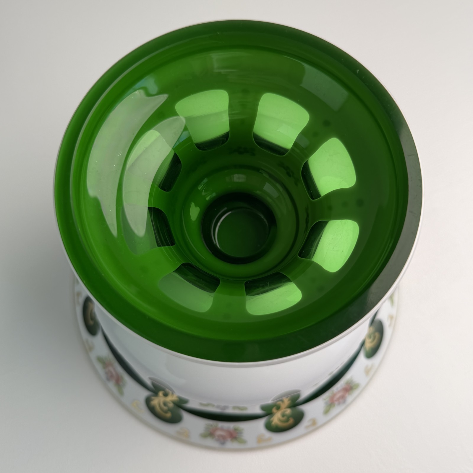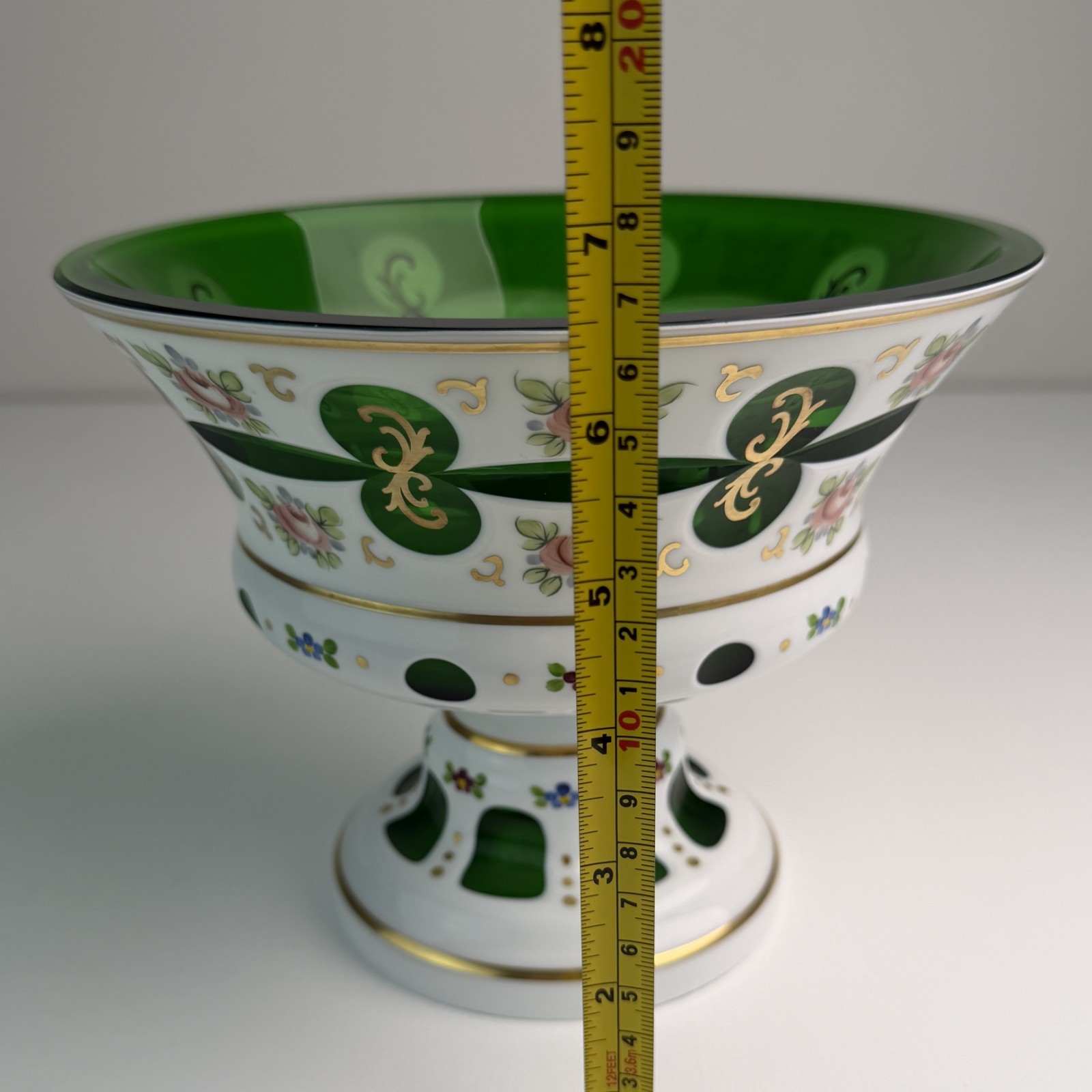 Elegant vintage Bohemian overlay glass compote bowl featuring a beautiful emerald green glass interior with a white overlay exterior richly decorated with hand-painted floral motifs and gold gilt accents. The bowl is raised on a decorative pedestal base with cut-out windows revealing the vibrant green glass beneath, creating a striking contrast between the opaque white overlay and the luminous green interior. The exterior is adorned with delicate pink roses, ornamental green medallions, and scrolling gold details, all finely hand painted. Pieces like this were produced in the Bohemian region (modern Czech Republic), famous for its high-quality decorative glassmaking traditions. The combination of colored overlay glass, hand-painted enamels, and gold decoration reflects classic Bohemian craftsmanship and mid-century European decorative style. This piece works beautifully as a centerpiece bowl, display compote, or decorative art glass accent. Condition Good vintage condition overall. There is: one small rim chip (see photo) a visible internal stress crack in the bowl interior (shown in photos) The piece remains structurally stable and displays very well. Approximate Measurements Height: about 6,5 inches Diameter: about 8–8.5 inches