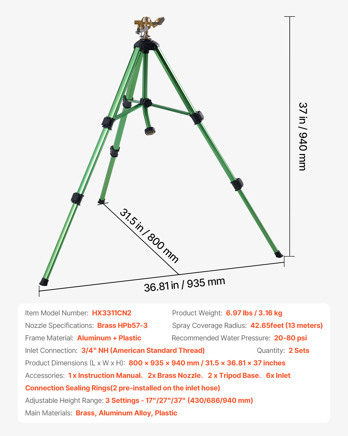 Tripod Lawn Sprinkler 2 Pack with 3/4" NH Connector, Heavy Duty