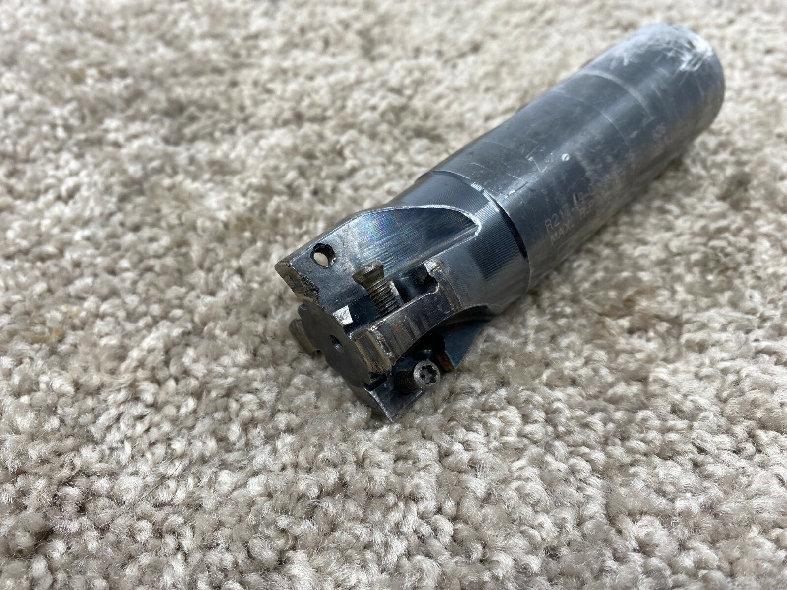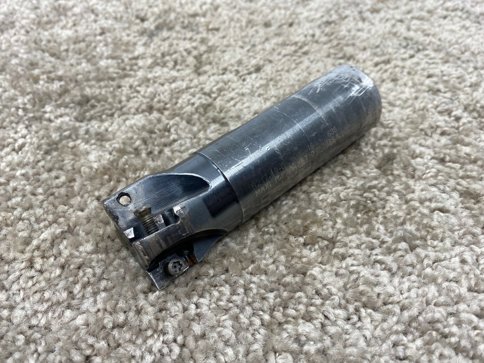 Made in the U.S.A. by Seco Carboloy. This is a used Indexable Square Shoulder End Mill / Milling Cutter in good condition. Item is missing a couple of the insert screws, but these can easily be replaced online. Model R217.69-01.50-3-16 Specifications: Cutting Diameter: 1.5" Cutting Depth: " Number of Flutes: 4 Number of Insert Stations: 4 Shank: 1.25" straight weldon Overall Length: 4.53" Comes as shown in pictures. -Ref 7-92