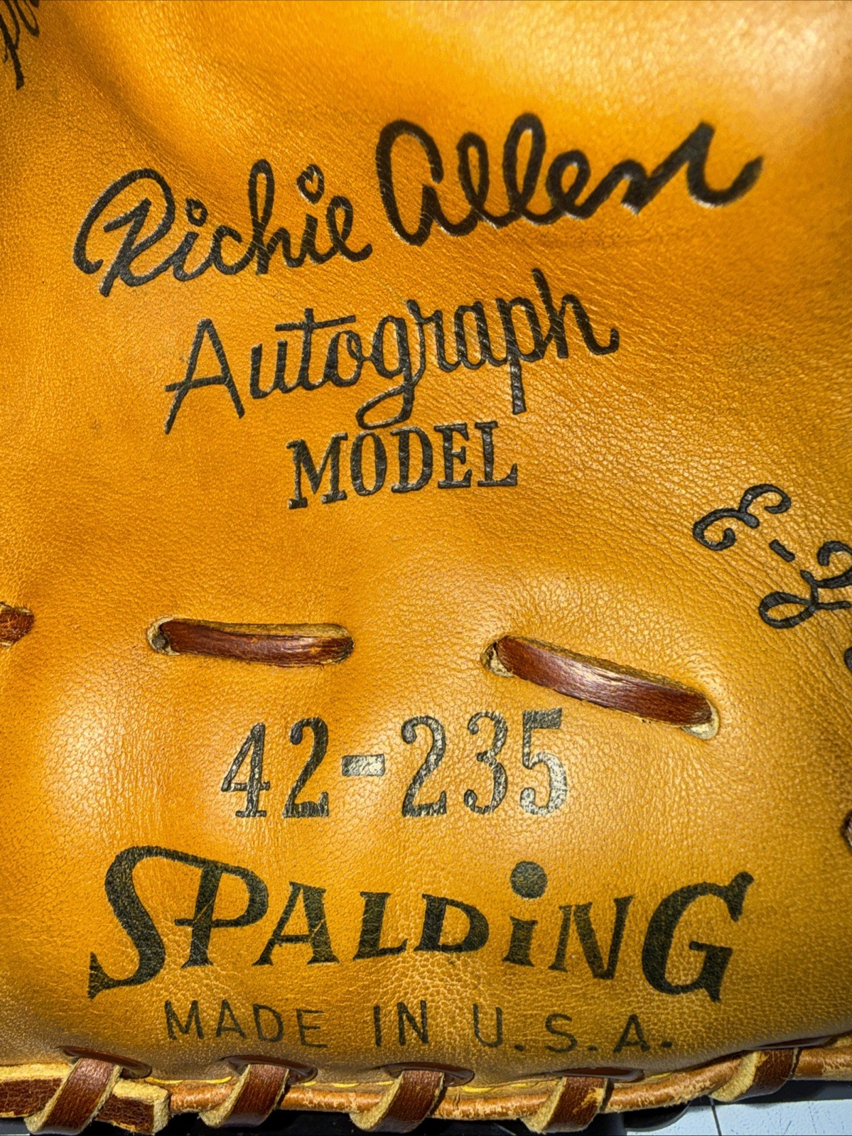 1960s Spalding model 42-235 Richie Allen Autograph Model fielder’s glove. Striking two-tone leather with a strong, athletic Spalding profile that defines this era. Balanced proportions, clean finger lines, and a naturally formed pocket give this glove exceptional visual presence. Right-hand throw.Condition is excellent for its age. Leather remains supple with honest, even wear and strong