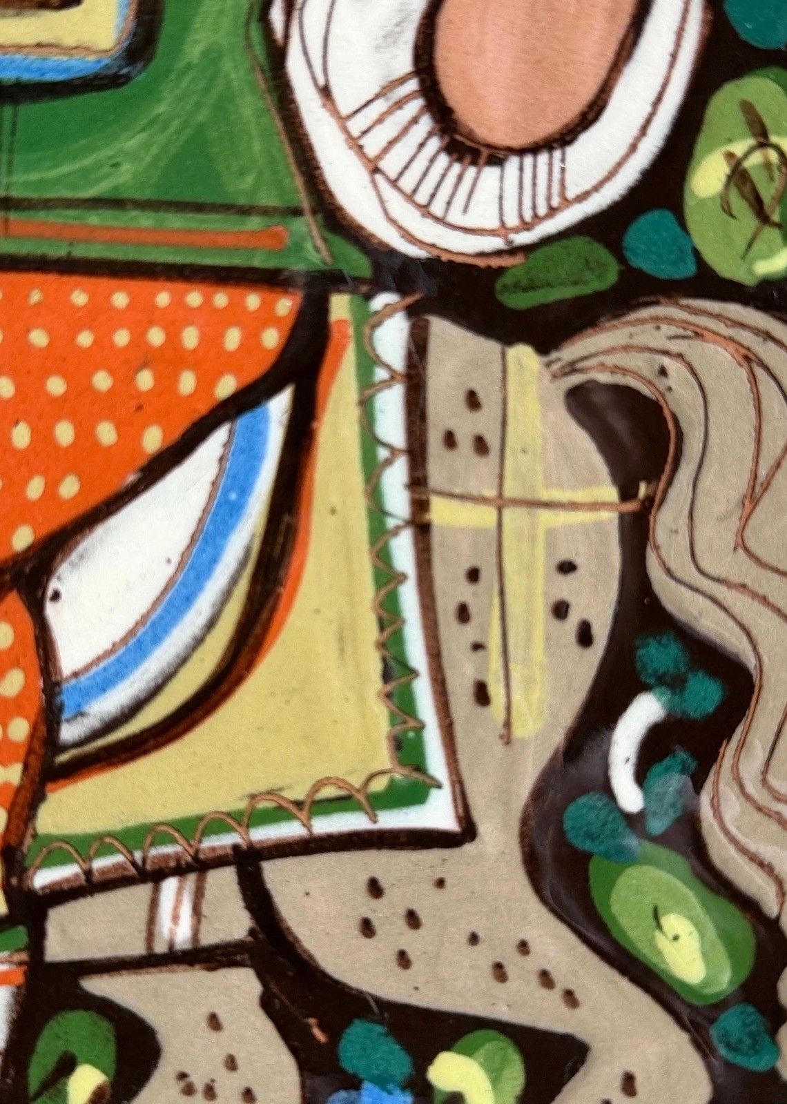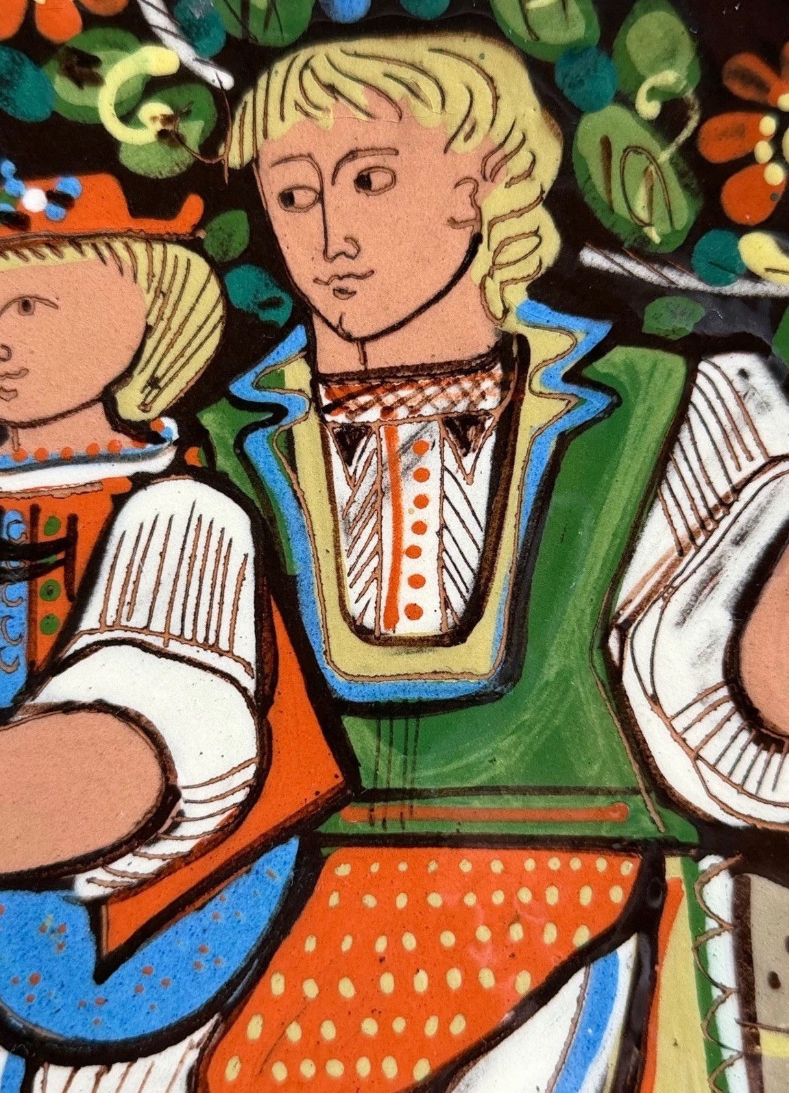 color sgraffito-style illustration of a traditional folk couple riding a horse, surrounded by lush floral and berry motifs.Product Highlights:• Maker: Schneider (Signed "Schneider Steffisburg" on base).• Origin: Steffisburg, Switzerland.• Design: Traditional Swiss Folk Art (Bauernkeramik) featuring a man and woman on horseback, a rooster, and intricate floral borders.• Technique: Hand-painted glaze over a deep chocolate-brown slip.• Model Number: Incised "431" on the underside.• Rarity: Pieces from the Schneider workshop are highly sought after by collectors of European studio pottery and Swiss folk art due to their high-quality craftsmanship and joyful subject matter.A Brief History:The village of Steffisburg has been a center for Swiss pottery for centuries. The Schneider workshop is one of the most celebrated names from this region, known for preserving the "Majolica" style of folk art. These pieces were often created as commemorative gifts or decorative display items for traditional Swiss homes.Condition Note:This item is in excellent vintage condition. The glaze remains glossy and the colors are exceptionally vivid. No major chips or cracks are visible (please see photos for close-up details).Summary:• "Authentic Swiss Craftsmanship"• "Mid-Century European Studio Pottery"• "Vibrant Sgraffito Technique"• "Perfect for Alpine or Farmhouse Decor"• "Highly Collectible Schneider Signature"• Swiss Pottery• Schneider Steffisburg• Folk Art Ceramic• Bauernkeramik• Vintage Switzerland• Hand Painted Bowl• Sgraffito Pottery• Alpine Decor• Studio Pottery• European Ceramics• Horse and Rider Folk Art• Majolica Style