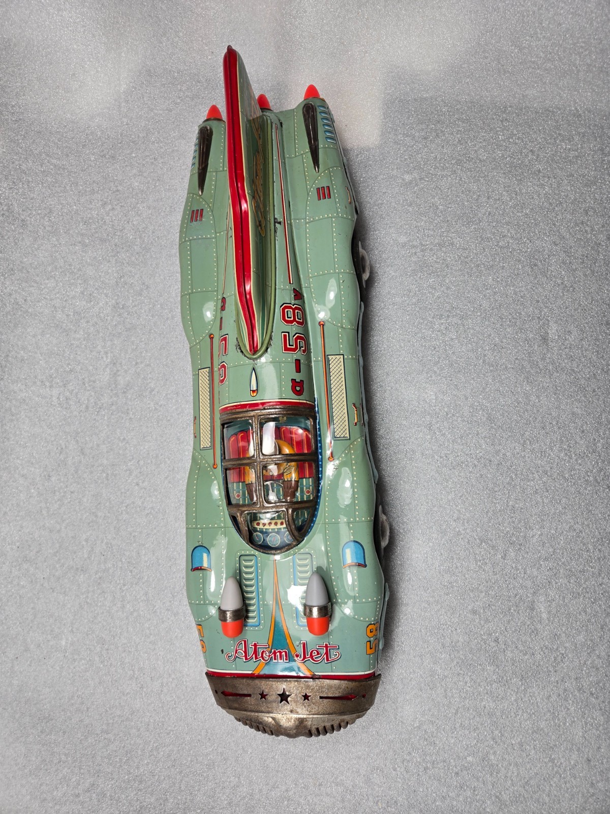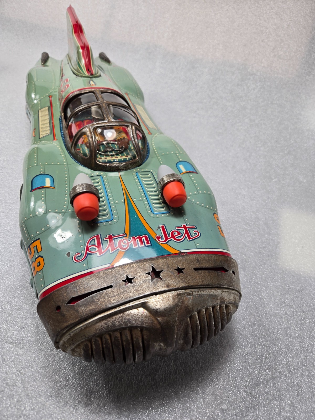 Atom Jet 58 Tin Racer. Produced by Yonezawa in 1954. This car is in very nice condition. The tail fin is original, as is the internal noise drum that works as it should. Atom Jet 58 Tin Racer was made in Japan, blending elements of jet-age futurism and high-speed racing. Measuring approximately 27 inches in length, this friction-powered racer was designed to captivate with its sleek, aerodynamic body, reminiscent of both classic Formula 1 race cars and futuristic rocket-powered vehicles. Please review all pictures and ask any questions before bidding. All taxes and duties are to be paid for by the buyer. ALL OFFERS WILL BE CONSIDERED. I AM REDUCING MY TOY COLLECTION SO WATCH FOR MORE ITEMS.